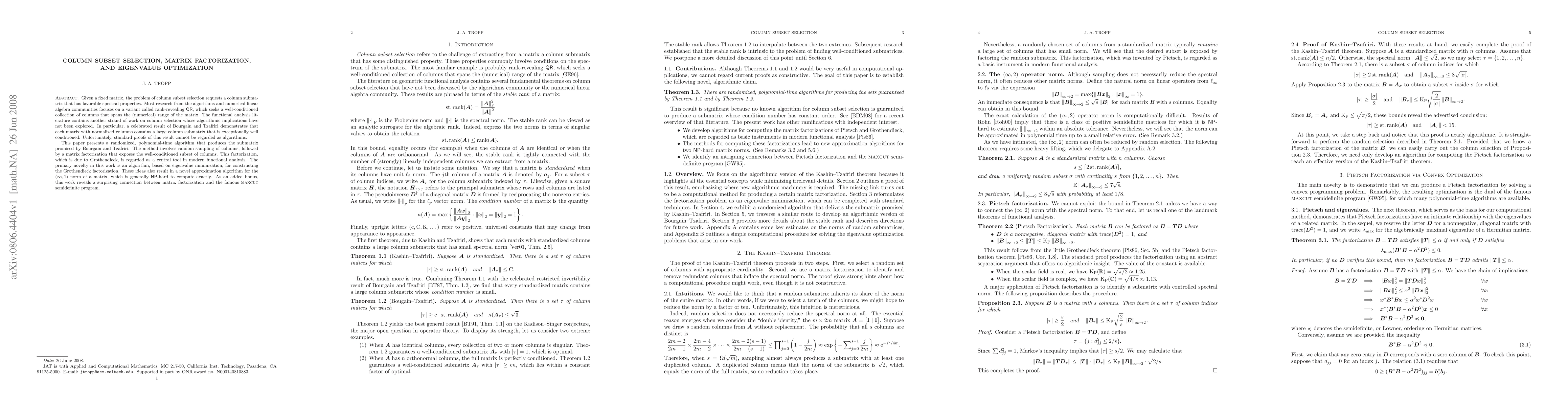 Given a fixed matrix, the problem of column subset selection requests a column submatrix that has favorable spectral properties. Most research from the algorithms and numerical linear algebra communities focuses on a variant called rank-revealing {\sf QR}, which seeks a well-conditioned collection of columns that spans the (numerical) range of the matrix. The functional analysis literature contains another strand of work on column selection whose algorithmic implications have not been explored. In particular, a celebrated result of Bourgain and Tzafriri demonstrates that each matrix with normalized columns contains a large column submatrix that is exceptionally well conditioned. Unfortunately, standard proofs of this result cannot be regarded as algorithmic. This paper presents a randomized, polynomial-time algorithm that produces the submatrix promised by Bourgain and Tzafriri. The method involves random sampling of columns, followed by a matrix factorization that exposes the well-conditioned subset of columns. This factorization, which is due to Grothendieck, is regarded as a central tool in modern functional analysis. The primary novelty in this work is an algorithm, based on eigenvalue minimization, for constructing the Grothendieck factorization. These ideas also result in a novel approximation algorithm for the $(\infty, 1)$ norm of a matrix, which is generally {\sf NP}-hard to compute exactly. As an added bonus, this work reveals a surprising connection between matrix factorization and the famous {\sc maxcut} semidefinite program.