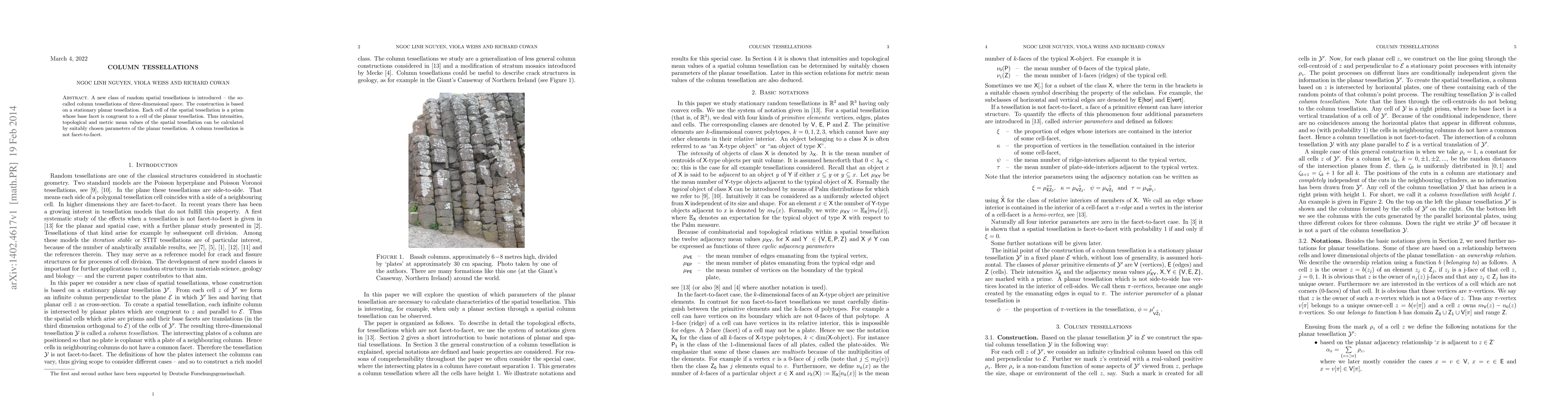 This paper introduces column tessellations, a novel class of random three-dimensional spatial tessellations derived from stationary planar tessellations, where each cell is a prism with a base congruent to a planar cell, allowing for the calculation of intensities and mean values based on planar parameters. Unlike typical tessellations, column tessellations do not have facet-to-facet contact.