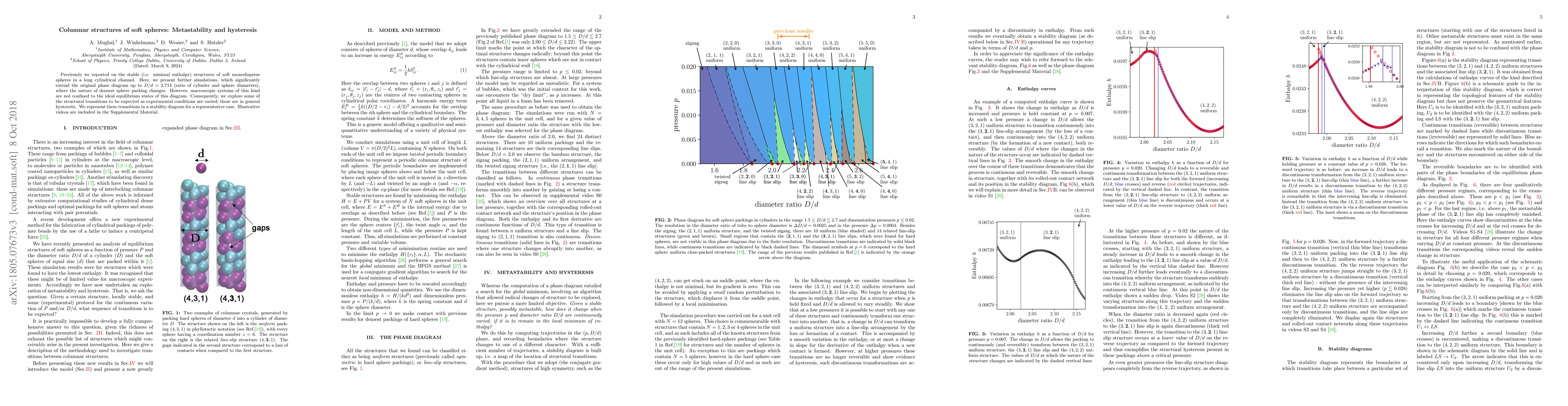 This paper extends simulations of soft sphere packing in cylindrical channels, revealing structural changes at D/d = 2.714. It investigates metastability and hysteresis in structural transitions under varying experimental conditions, presenting a stability diagram for these transitions.