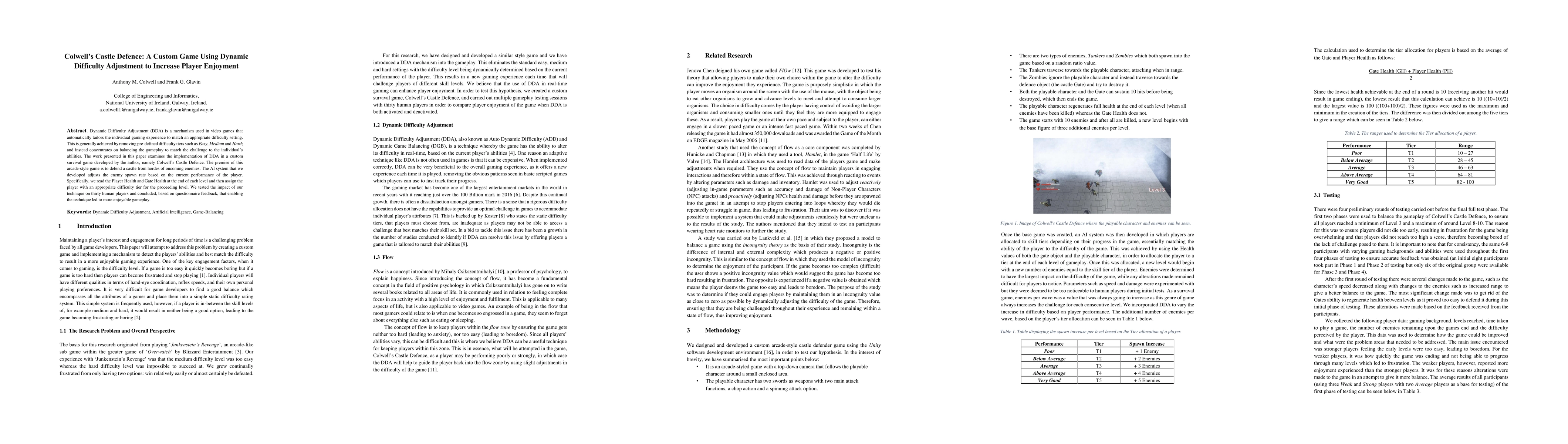 Dynamic Difficulty Adjustment (DDA) is a mechanism used in video games that automatically tailors the individual gaming experience to match an appropriate difficulty setting. This is generally achieved by removing pre-defined difficulty tiers such as Easy, Medium and Hard; and instead concentrates on balancing the gameplay to match the challenge to the individual's abilities. The work presented in this paper examines the implementation of DDA in a custom survival game developed by the author, namely Colwell's Castle Defence. The premise of this arcade-style game is to defend a castle from hordes of oncoming enemies. The AI system that we developed adjusts the enemy spawn rate based on the current performance of the player. Specifically, we read the Player Health and Gate Health at the end of each level and then assign the player with an appropriate difficulty tier for the proceeding level. We tested the impact of our technique on thirty human players and concluded, based on questionnaire feedback, that enabling the technique led to more enjoyable gameplay.