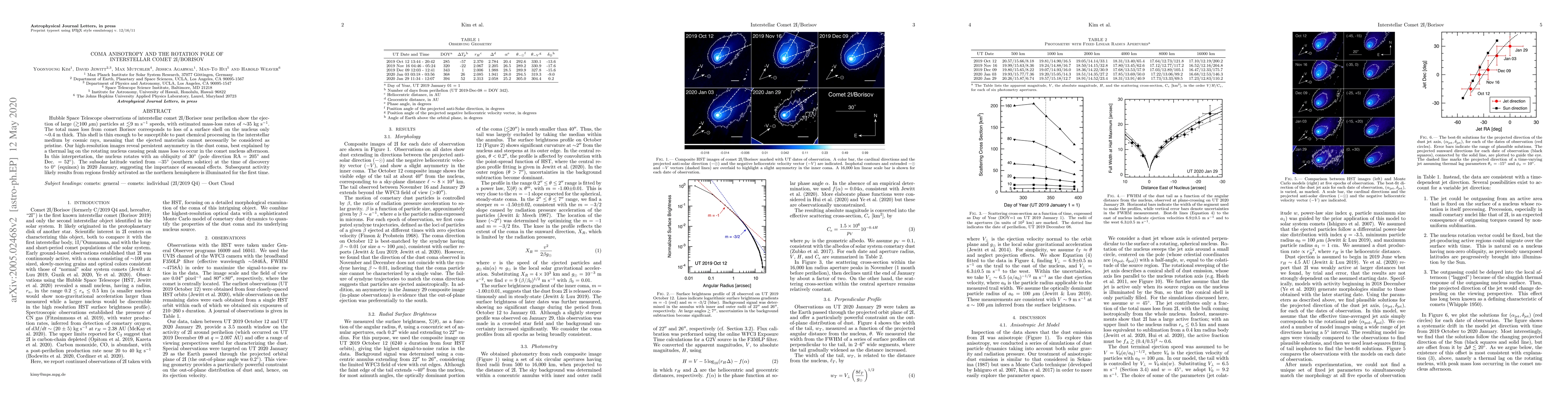 This study uses Hubble Space Telescope observations to analyze the coma anisotropy of interstellar comet 2I/Borisov, revealing persistent asymmetry likely due to thermal lag on its rotating nucleus. The comet's rotation axis is estimated to have an obliquity of 30 degrees, with the rotation pole direction at RA = 205 deg and Dec. = 52 deg.