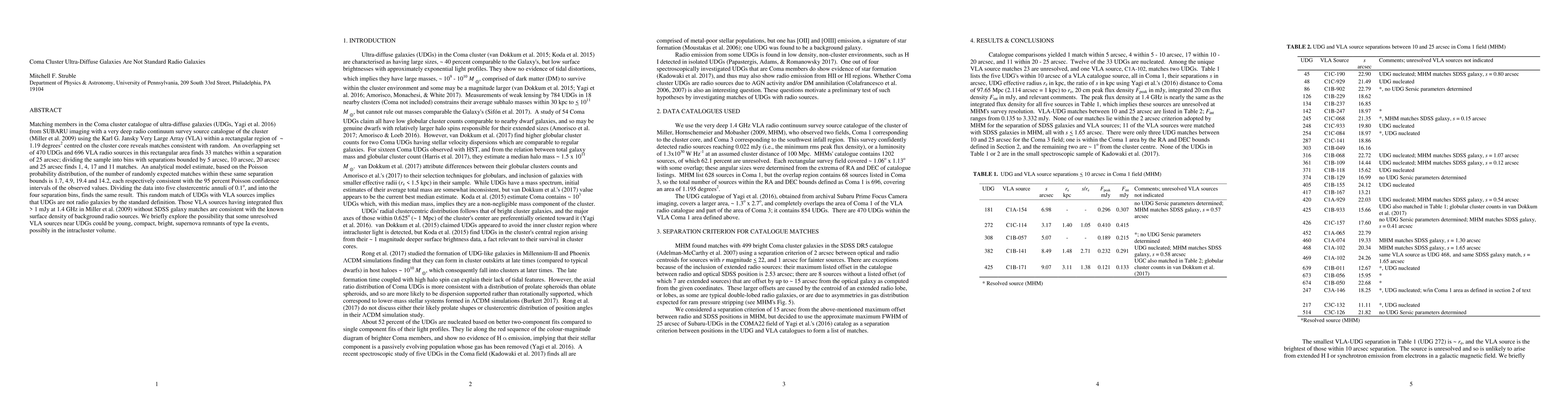 Matching members in the Coma cluster catalogue of ultra-diffuse galaxies (UDGs, Yagi et al. 2016) from SUBARU imaging with a very deep radio continuum survey source catalogue of the cluster (Miller et al. 2009) using the Karl G. Jansky Very Large Array (VLA) within a rectangular region of ~ 1.19 square degrees centred on the cluster core reveals matches consistent with random. An overlapping set of 470 UDGs and 696 VLA radio sources in this rectangular area finds 33 matches within a separation of 25 arcsec; dividing the sample into bins with separations bounded by 5 arcsec, 10 arcsec, 20 arcsec and 25 arcsec finds 1, 4, 17 and 11 matches. An analytical model estimate, based on the Poisson probability distribution, of the number of randomly expected matches within these same separation bounds is 1.7, 4.9, 19.4 and 14.2, each respectively consistent with the 95 percent Poisson confidence intervals of the observed values. Dividing the data into five clustercentric annuli of 0.1 degree, and into the four separation bins, finds the same result. This random match of UDGs with VLA sources implies that UDGs are not radio galaxies by the standard definition. Those VLA sources having integrated flux > 1 mJy at 1.4 GHz in Miller et al. (2009) without SDSS galaxy matches are consistent with the known surface density of background radio sources. We briefly explore the possibility that some unresolved VLA sources near UDGs could be young, compact, bright, supernova remnants of type Ia events, possibly in the intracluster volume.