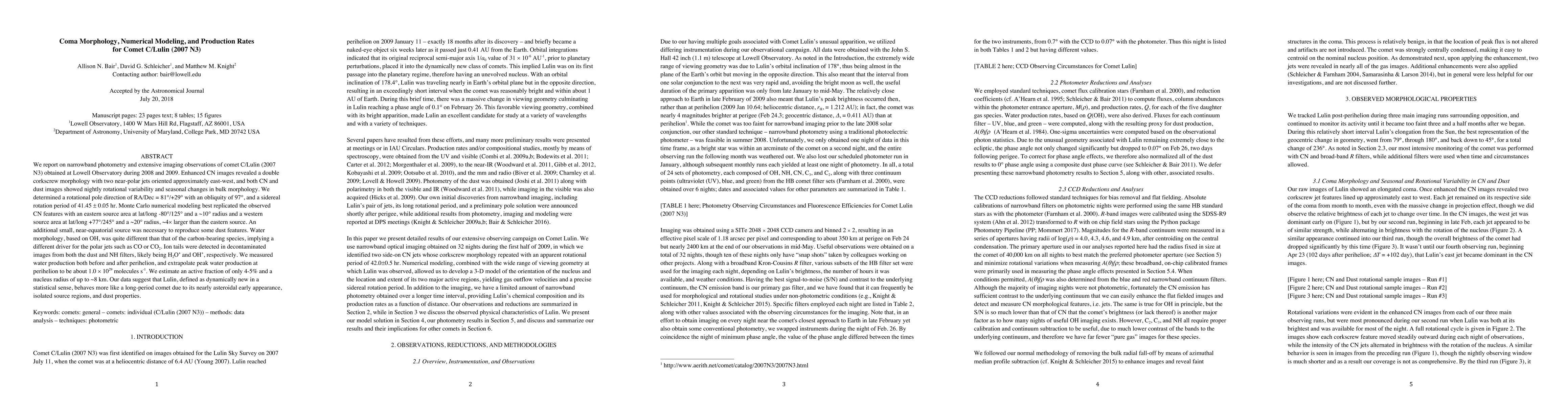 This paper analyzes comet C/Lulin (2007 N3) using narrowband photometry and imaging, revealing a double corkscrew morphology with distinct carbon-bearing and water jet sources. Numerical modeling estimates a peak water production rate of 1.0*10^29 molecules/s and suggests Lulin behaves more like a long-period comet due to its isolated source regions and asteroidal characteristics.