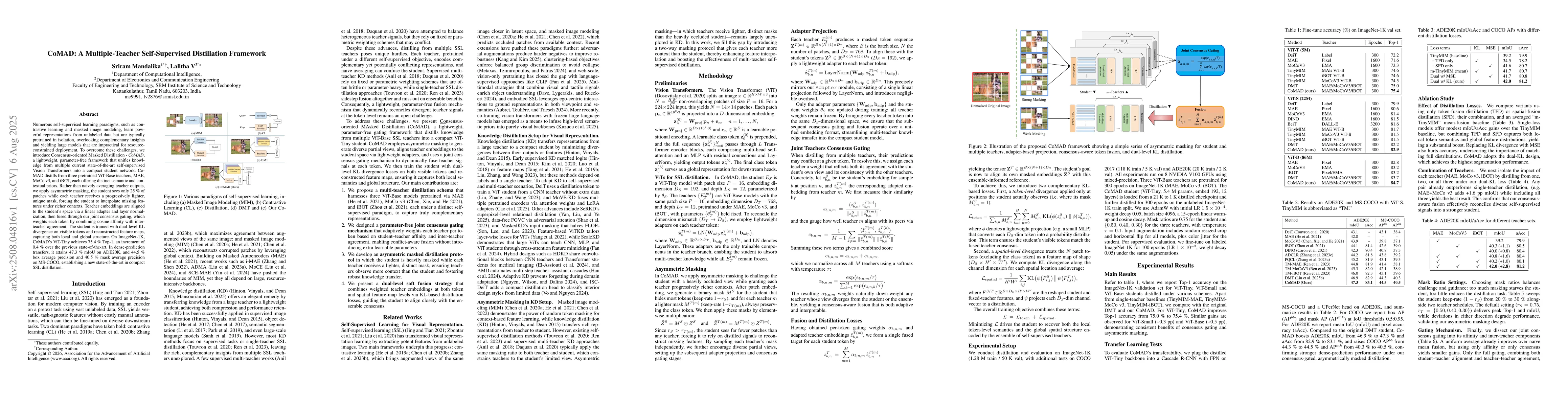 Numerous self-supervised learning paradigms, such as contrastive learning and masked image modeling, learn powerful representations from unlabeled data but are typically pretrained in isolation, overlooking complementary insights and yielding large models that are impractical for resource-constrained deployment. To overcome these challenges, we introduce Consensus-oriented Masked Distillation (CoMAD), a lightweight, parameter-free framework that unifies knowledge from multiple current state-of-the-art self-supervised Vision Transformers into a compact student network. CoMAD distills from three pretrained ViT-Base teachers, MAE, MoCo v3, and iBOT, each offering distinct semantic and contextual priors. Rather than naively averaging teacher outputs, we apply asymmetric masking: the student sees only 25 percent of patches while each teacher receives a progressively lighter, unique mask, forcing the student to interpolate missing features under richer contexts. Teacher embeddings are aligned to the student's space via a linear adapter and layer normalization, then fused through our joint consensus gating, which weights each token by combining cosine affinity with inter-teacher agreement. The student is trained with dual-level KL divergence on visible tokens and reconstructed feature maps, capturing both local and global structure. On ImageNet-1K, CoMAD's ViT-Tiny achieves 75.4 percent Top-1, an increment of 0.4 percent over the previous state-of-the-art. In dense-prediction transfers, it attains 47.3 percent mIoU on ADE20K, and 44.5 percent box average precision and 40.5 percent mask average precision on MS-COCO, establishing a new state-of-the-art in compact SSL distillation.