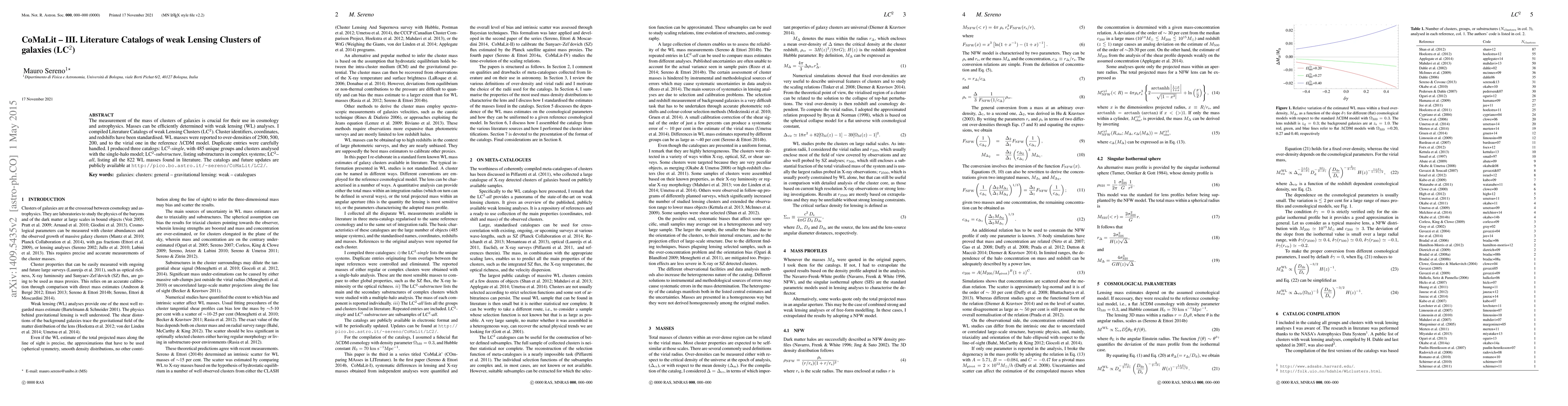 The measurement of the mass of clusters of galaxies is crucial for their use in cosmology and astrophysics. Masses can be efficiently determined with weak lensing (WL) analyses. I compiled Literature Catalogs of weak Lensing Clusters (LC$^2$). Cluster identifiers, coordinates, and redshifts have been standardised. WL masses were reported to over-densities of 2500, 500, 200, and to the virial one in the reference $\Lambda$CDM model. Duplicate entries were carefully handled. I produced three catalogs: LC$^2$-single, with 485 unique groups and clusters analysed with the single-halo model; LC$^2$-substructure, listing substructures in complex systems; LC$^2$-all, listing all the 822 WL masses found in literature. The catalogs and future updates are publicly available at http://pico.bo.astro.it/~sereno/CoMaLit/LC2/.