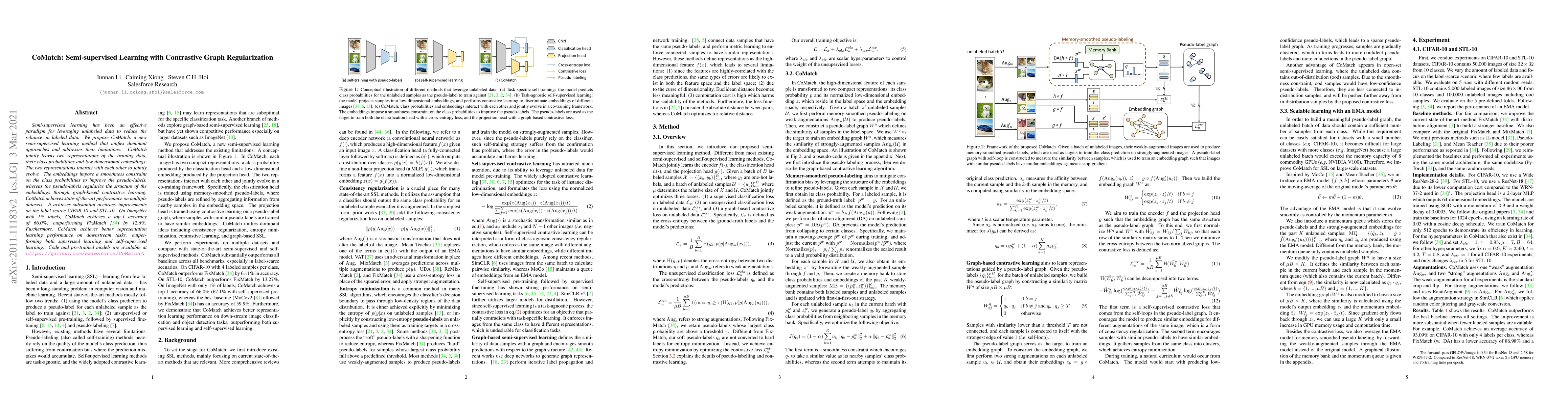 CoMatch is a new semi-supervised learning method that uses contrastive graph regularization to jointly learn two representations of data, enhancing pseudo-label accuracy and embedding smoothness, achieving state-of-the-art performance on multiple datasets, especially with limited labeled data.