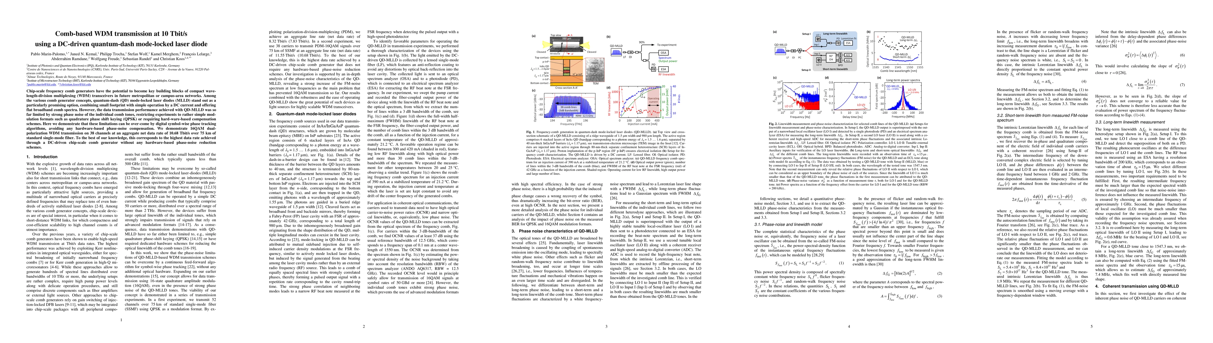This research demonstrates a DC-driven quantum-dash mode-locked laser diode-based frequency comb generator enabling 10.68 Tbit/s dual-polarization WDM transmission over 75 km, overcoming previous phase noise limitations through digital phase tracking without hardware compensation.
