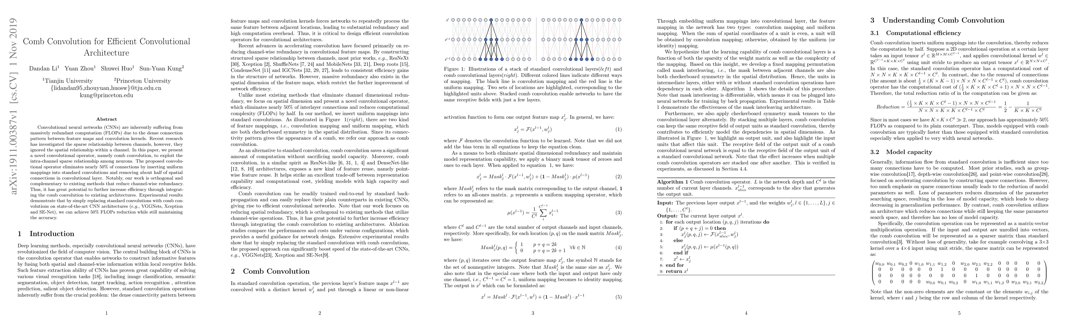 Convolutional neural networks (CNNs) are inherently suffering from massively redundant computation (FLOPs) due to the dense connection pattern between feature maps and convolution kernels. Recent research has investigated the sparse relationship between channels, however, they ignored the spatial relationship within a channel. In this paper, we present a novel convolutional operator, namely comb convolution, to exploit the intra-channel sparse relationship among neurons. The proposed convolutional operator eliminates nearly 50% of connections by inserting uniform mappings into standard convolutions and removing about half of spatial connections in convolutional layer. Notably, our work is orthogonal and complementary to existing methods that reduce channel-wise redundancy. Thus, it has great potential to further increase efficiency through integrating the comb convolution to existing architectures. Experimental results demonstrate that by simply replacing standard convolutions with comb convolutions on state-of-the-art CNN architectures (e.g., VGGNets, Xception and SE-Net), we can achieve 50% FLOPs reduction while still maintaining the accuracy.