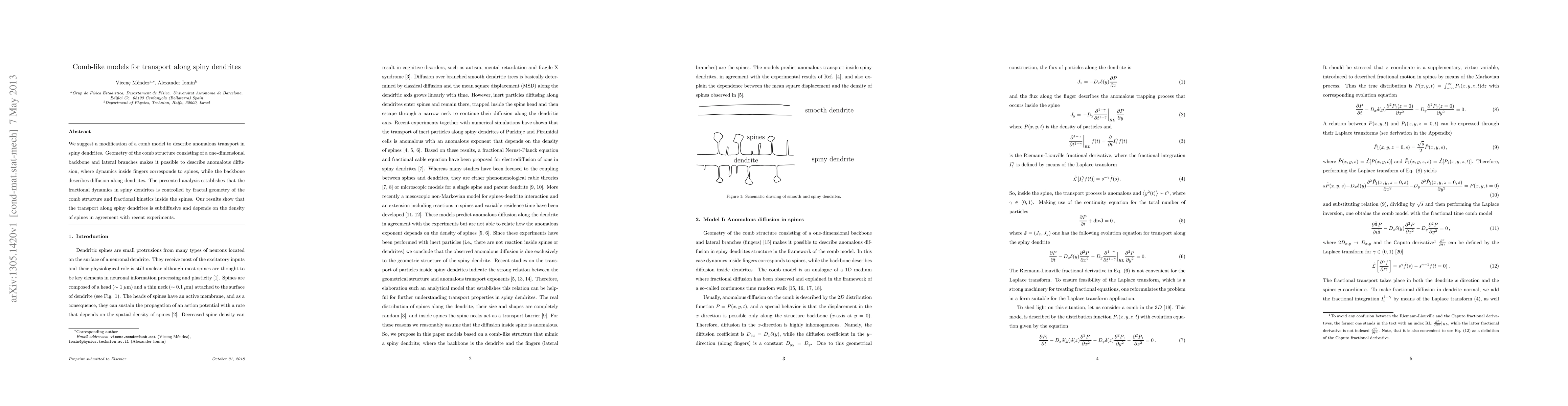 This paper proposes a modified comb model to explain anomalous transport in spiny dendrites, where the fractal geometry of the comb structure and fractional kinetics within spines control subdiffusive diffusion along dendrites, aligning with recent experimental findings on spine density effects.