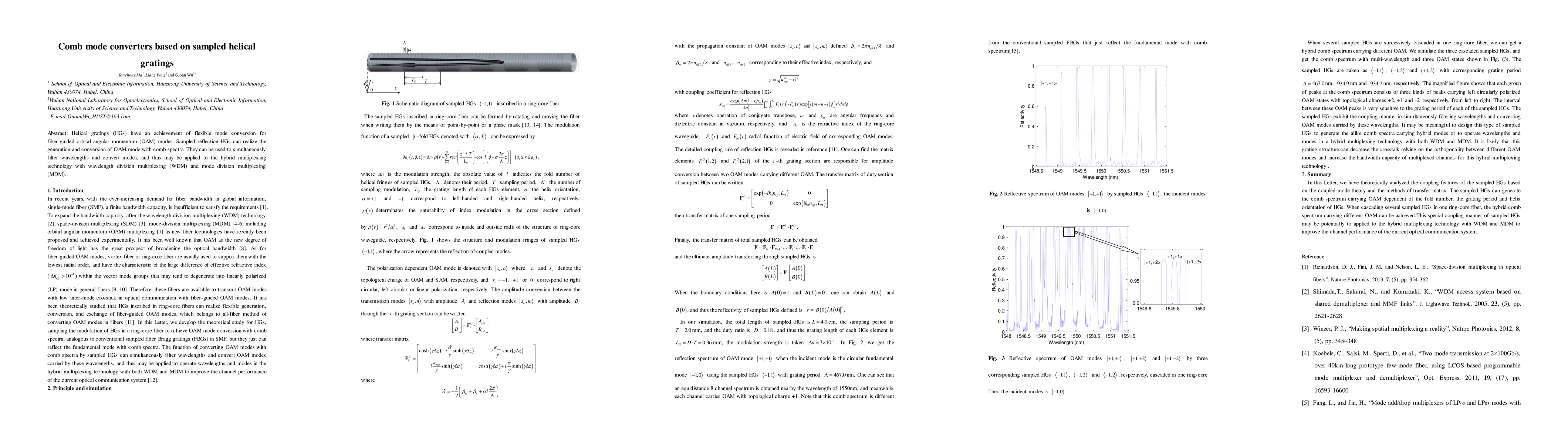 Helical gratings (HGs) enable flexible mode conversion for fibre guided orbital angular momentum (OAM) modes, with sampled reflection HGs generating comb spectra to facilitate wavelength filtering and mode conversion, potentially enhancing hybrid multiplexing technologies.