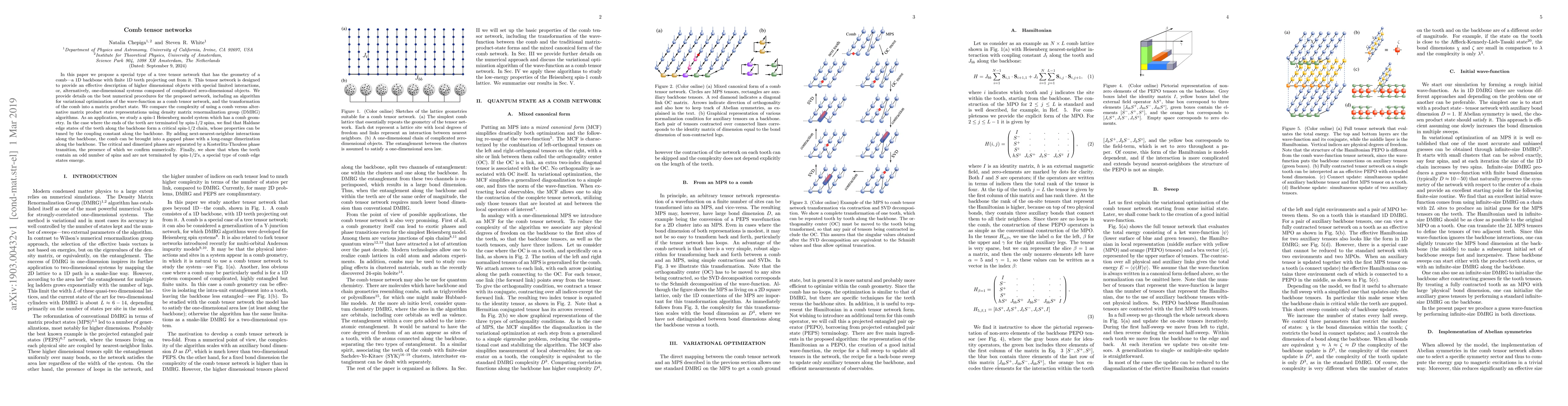 This paper introduces a comb tensor network with a 1D backbone and 1D teeth for describing systems with limited interactions. It details numerical optimization and transformation methods, and applies the model to a spin-1 Heisenberg system, revealing critical and dimerized phases separated by a Kosterlitz-Thouless transition.