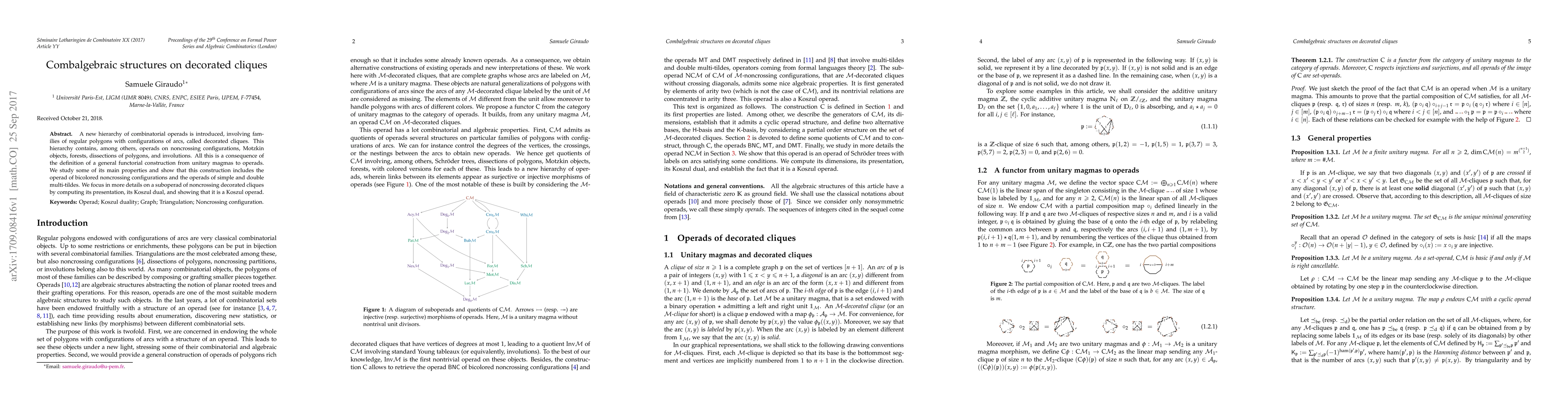 This paper introduces a new hierarchy of combinatorial operads based on decorated cliques, which are regular polygons with arc configurations. The study reveals connections to various structures like noncrossing configurations and forests, and it presents a functorial construction from unitary magmas to operads, including detailed analysis of a suboperad's presentation, Koszul dual, and its Koszul property.