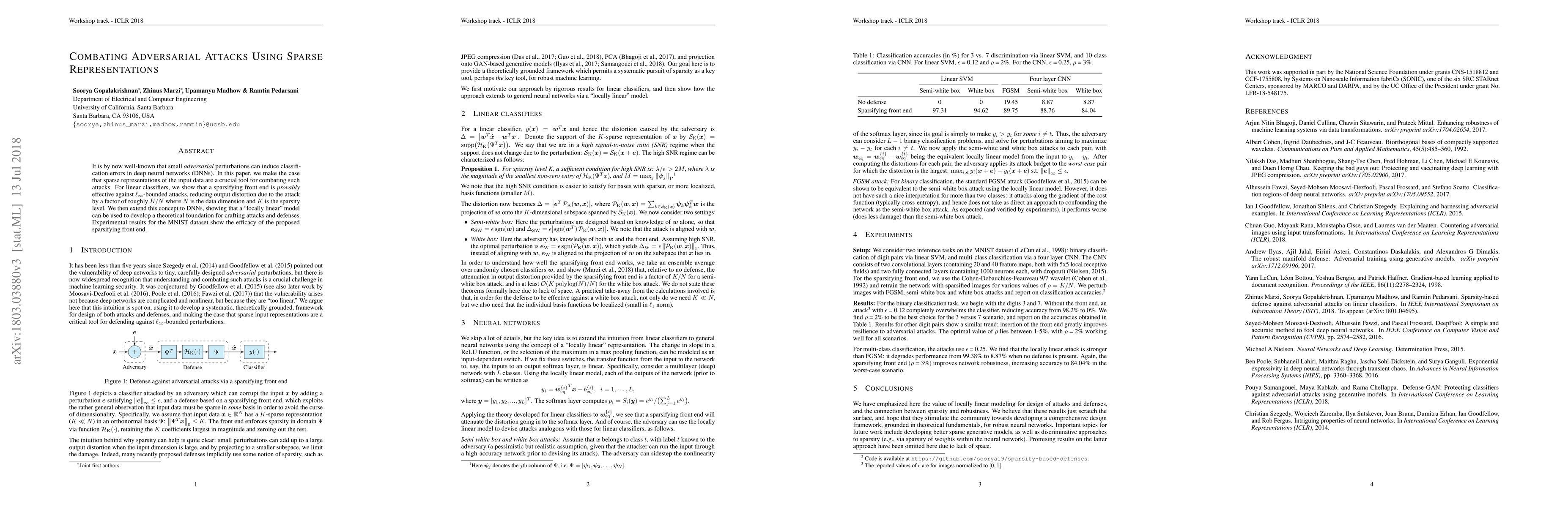 This paper proposes using sparse representations to defend against adversarial attacks on deep neural networks, demonstrating that a sparsifying front end can significantly reduce attack-induced classification errors. Experimental results on the MNIST dataset validate the effectiveness of the proposed method.