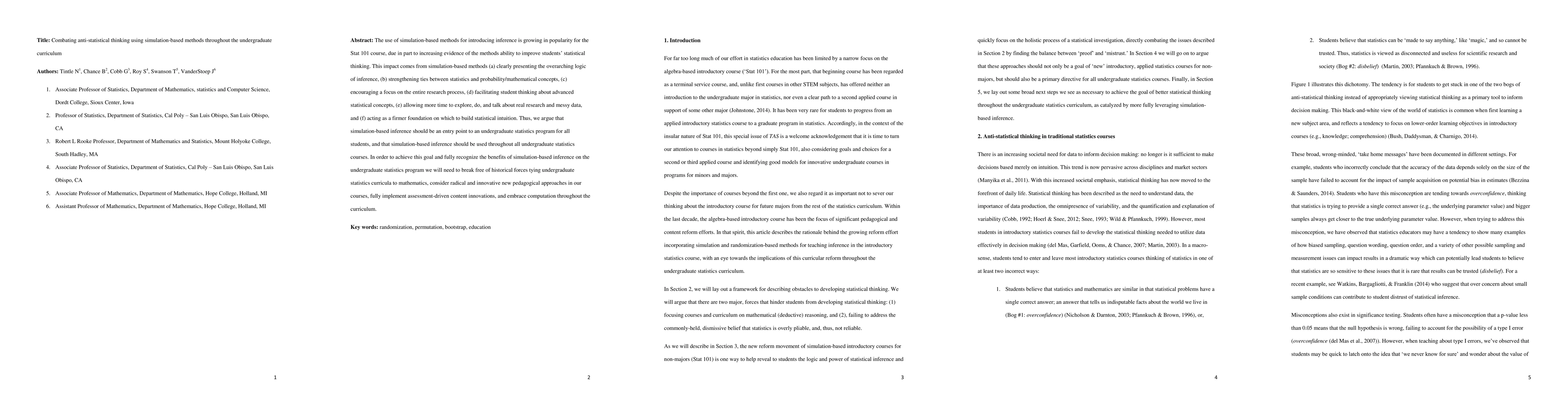 This paper advocates for the integration of simulation-based methods across the undergraduate statistics curriculum to enhance students' statistical thinking, emphasizing the benefits of this approach in teaching inference and fostering a deeper understanding of statistical concepts. It calls for a shift in pedagogical strategies and curriculum design to fully realize these benefits.