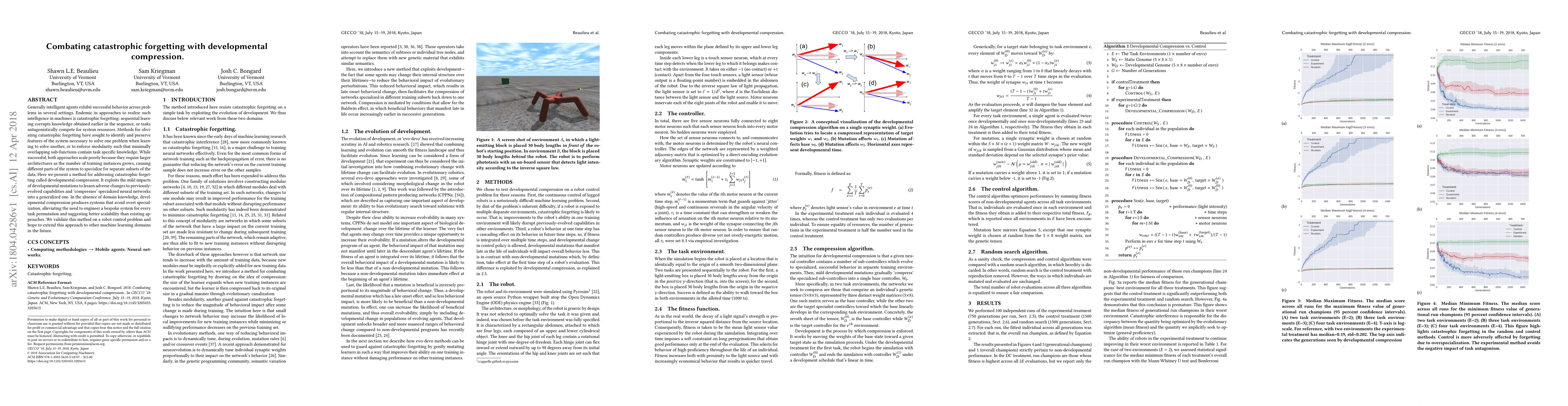 Generally intelligent agents exhibit successful behavior across problems in several settings. Endemic in approaches to realize such intelligence in machines is catastrophic forgetting: sequential learning corrupts knowledge obtained earlier in the sequence, or tasks antagonistically compete for system resources. Methods for obviating catastrophic forgetting have sought to identify and preserve features of the system necessary to solve one problem when learning to solve another, or to enforce modularity such that minimally overlapping sub-functions contain task specific knowledge. While successful, both approaches scale poorly because they require larger architectures as the number of training instances grows, causing different parts of the system to specialize for separate subsets of the data. Here we present a method for addressing catastrophic forgetting called developmental compression. It exploits the mild impacts of developmental mutations to lessen adverse changes to previously-evolved capabilities and `compresses' specialized neural networks into a generalized one. In the absence of domain knowledge, developmental compression produces systems that avoid overt specialization, alleviating the need to engineer a bespoke system for every task permutation and suggesting better scalability than existing approaches. We validate this method on a robot control problem and hope to extend this approach to other machine learning domains in the future.
