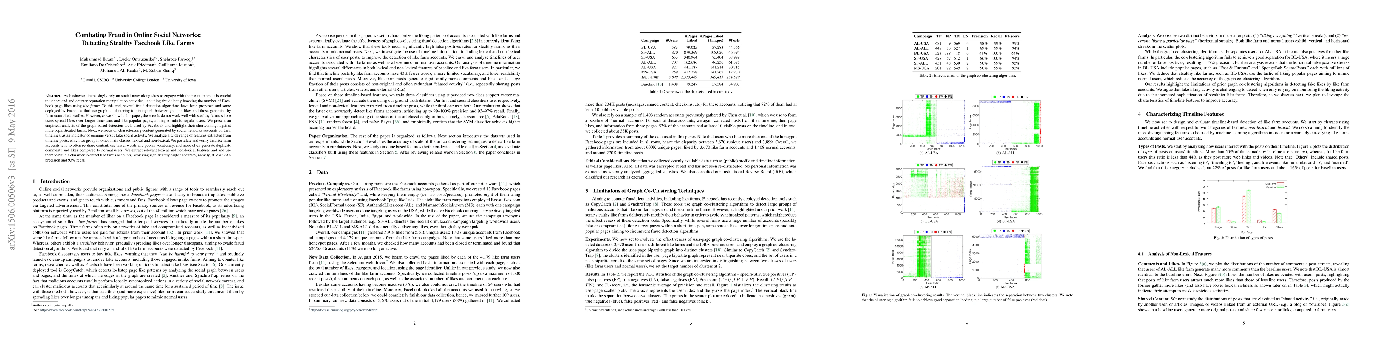 This paper investigates the limitations of Facebook's graph co-clustering algorithms for detecting stealthy like farms and proposes a new method based on analyzing content from social network accounts. The new approach, leveraging lexical and non-lexical features from timeline posts, achieves 99% precision and 93% recall in identifying fraudulent like farm accounts.
