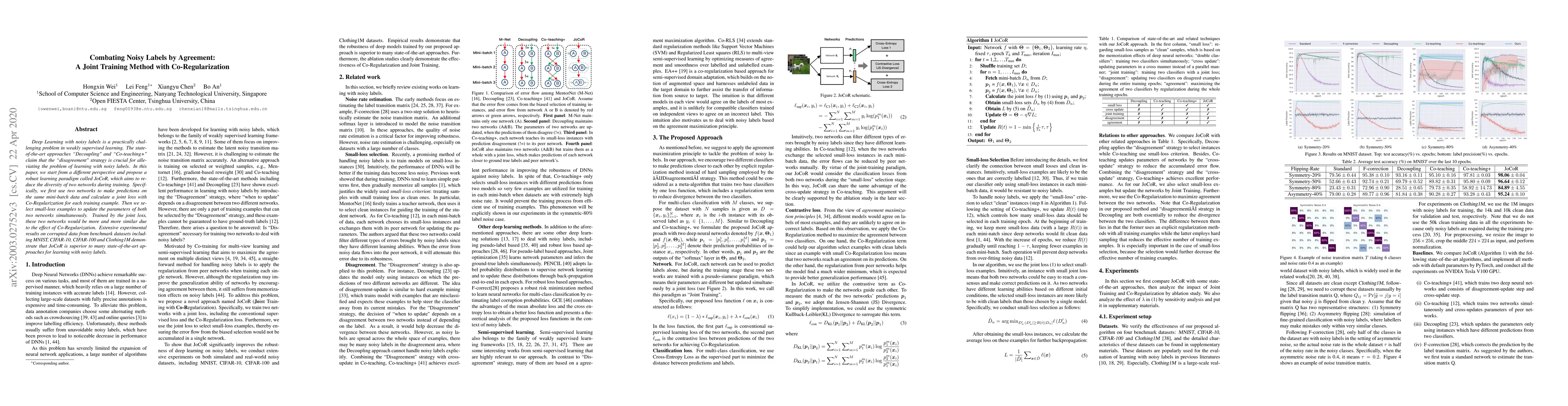 This paper proposes JoCoR, a joint training method with co-regularization to combat noisy labels in deep learning. By training two networks to minimize a joint loss and using co-regularization to reduce their diversity, JoCoR outperforms state-of-the-art methods on benchmark datasets.
