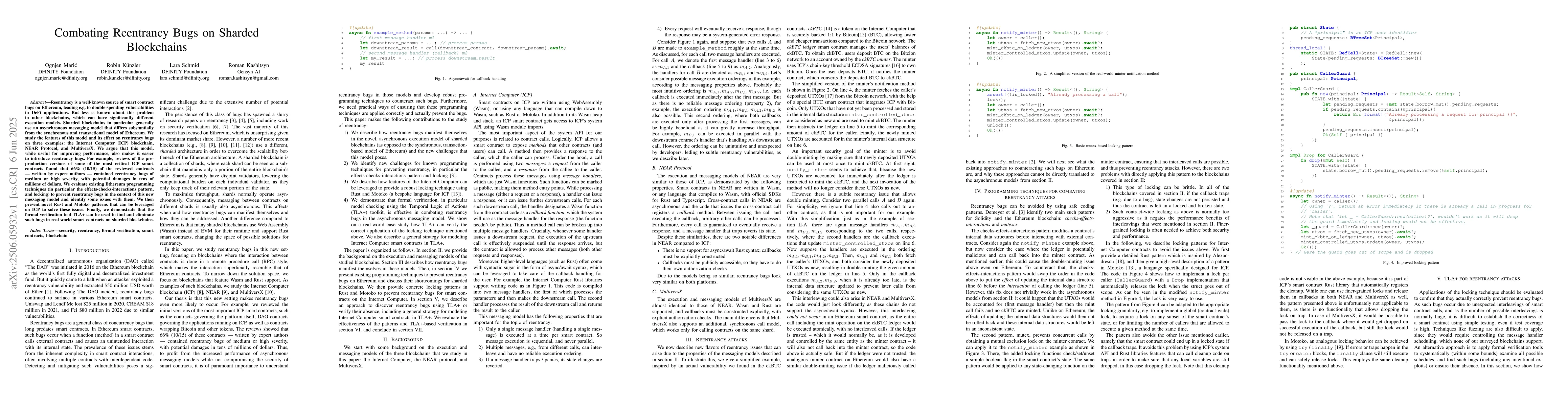 This research examines reentrancy bugs, common in Ethereum smart contracts, on sharded blockchains like ICP, NEAR, and MultiversX. It finds that these blockchains' asynchronous messaging models, while performance-enhancing, also increase reentrancy bug risks, with 66% of reviewed ICP contracts having severe bugs. The study evaluates Ethereum prevention techniques, identifies issues, proposes novel Rust and Motoko patterns, and demonstrates TLA+ tool's effectiveness in eliminating such bugs.