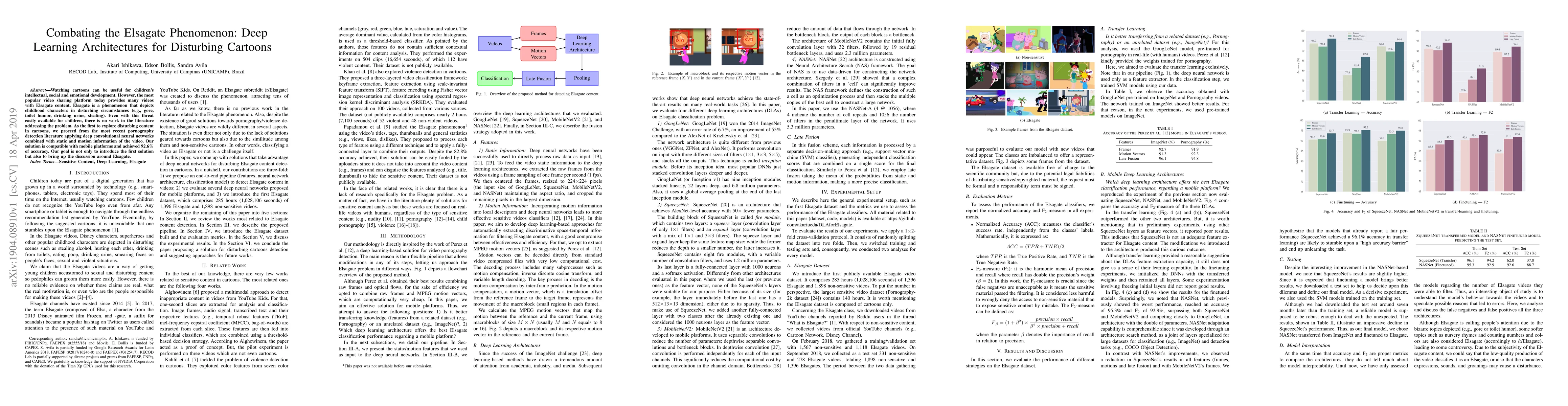 Watching cartoons can be useful for children's intellectual, social and emotional development. However, the most popular video sharing platform today provides many videos with Elsagate content. Elsagate is a phenomenon that depicts childhood characters in disturbing circumstances (e.g., gore, toilet humor, drinking urine, stealing). Even with this threat easily available for children, there is no work in the literature addressing the problem. As the first to explore disturbing content in cartoons, we proceed from the most recent pornography detection literature applying deep convolutional neural networks combined with static and motion information of the video. Our solution is compatible with mobile platforms and achieved 92.6% of accuracy. Our goal is not only to introduce the first solution but also to bring up the discussion around Elsagate.