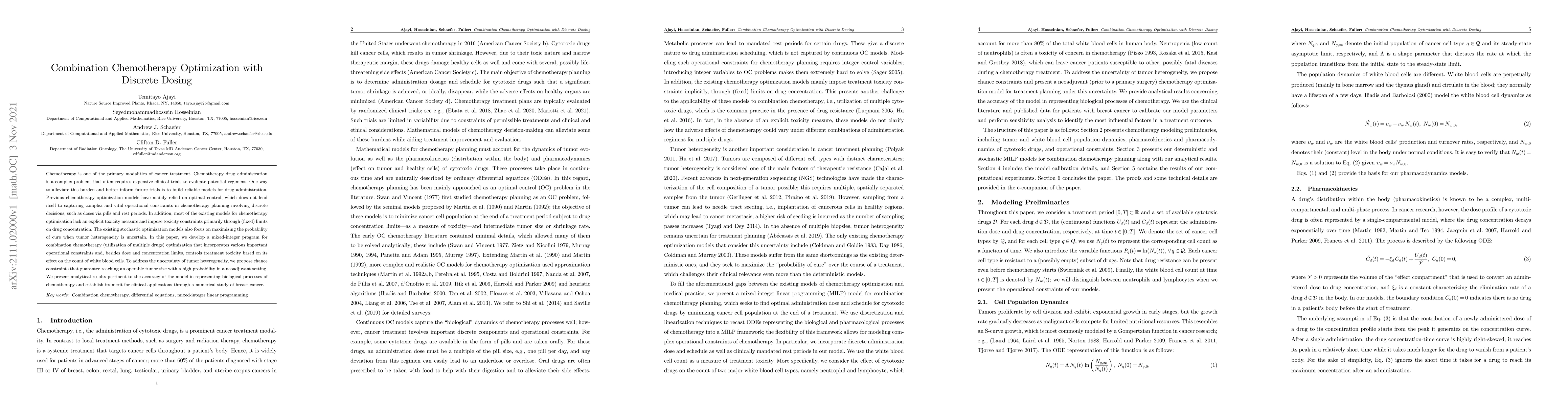 This paper develops a mixed-integer program for optimizing combination chemotherapy that incorporates operational constraints and explicitly controls toxicity based on white blood cell counts, using chance constraints to address tumor heterogeneity uncertainty, validated through a breast cancer numerical study.