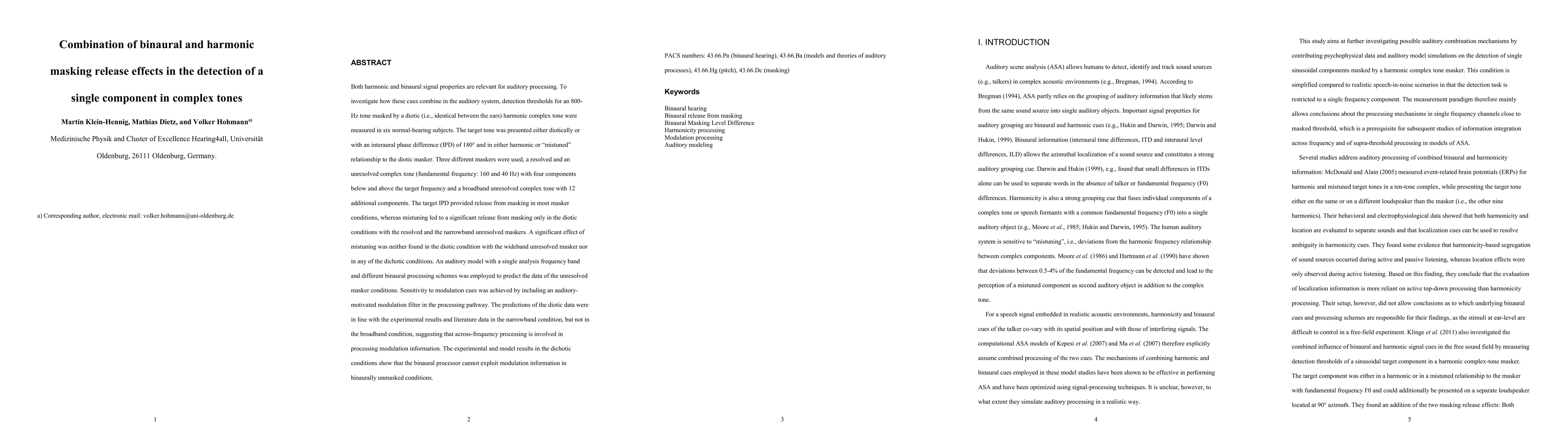 This paper explores how binaural and harmonic cues combine to aid in detecting a single tone within complex sounds. Experiments show that binaural phase differences improve detection, while harmonic mistuning aids detection only under specific conditions, suggesting complex interactions between binaural and harmonic processing in the auditory system.