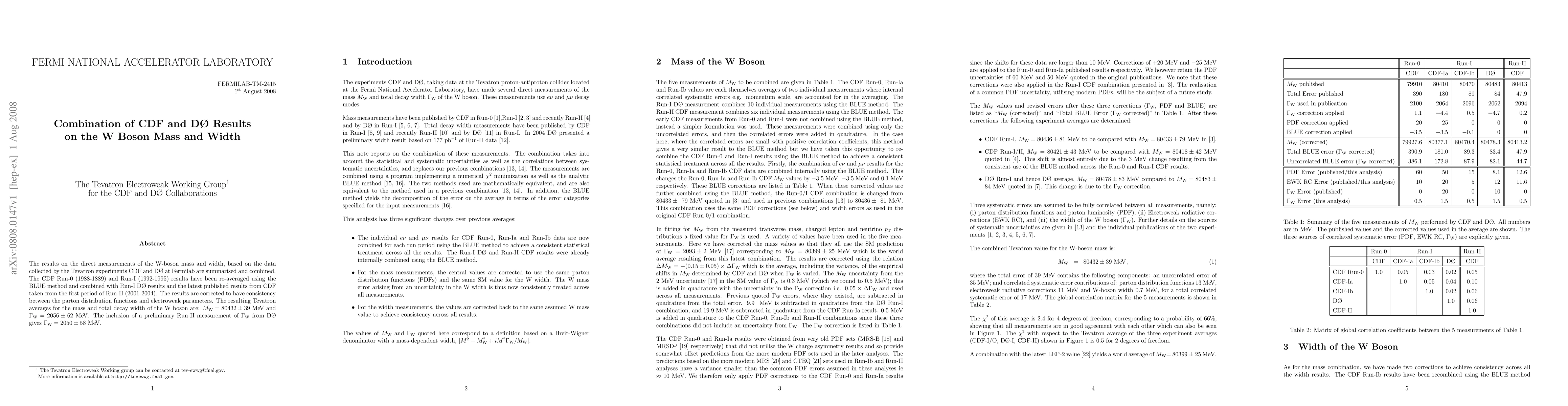 Researchers combined data from CDF and D0 Tevatron experiments to update W boson mass and width measurements, resulting in averages of 80432 MeV for mass and 2056 MeV for total decay width.