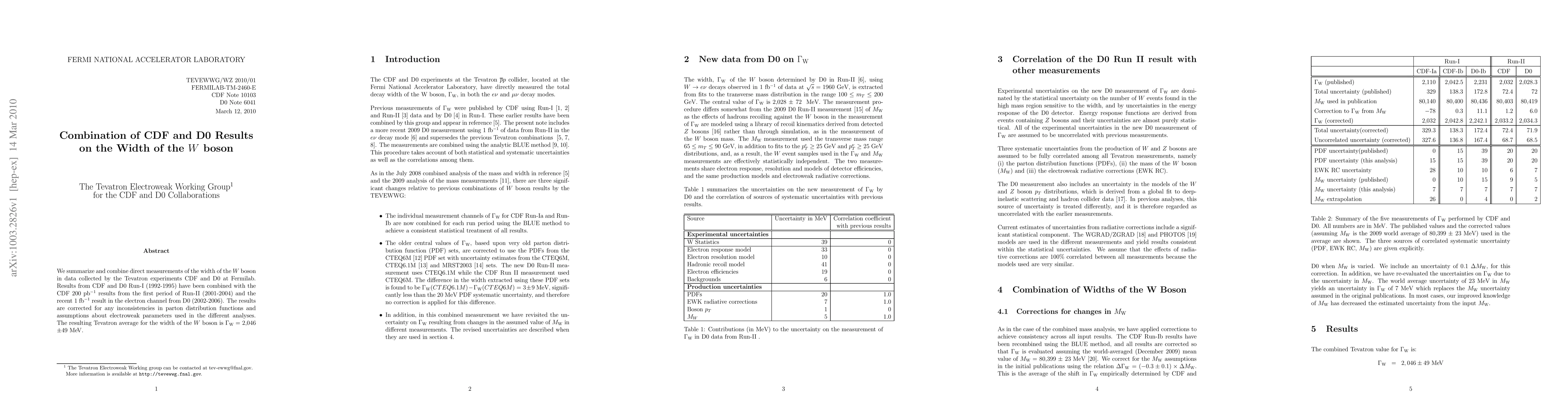 Researchers combined data from CDF and D0 experiments to measure the width of the W boson, finding an average width of 2,046 MeV with a precision of 49 MeV.
