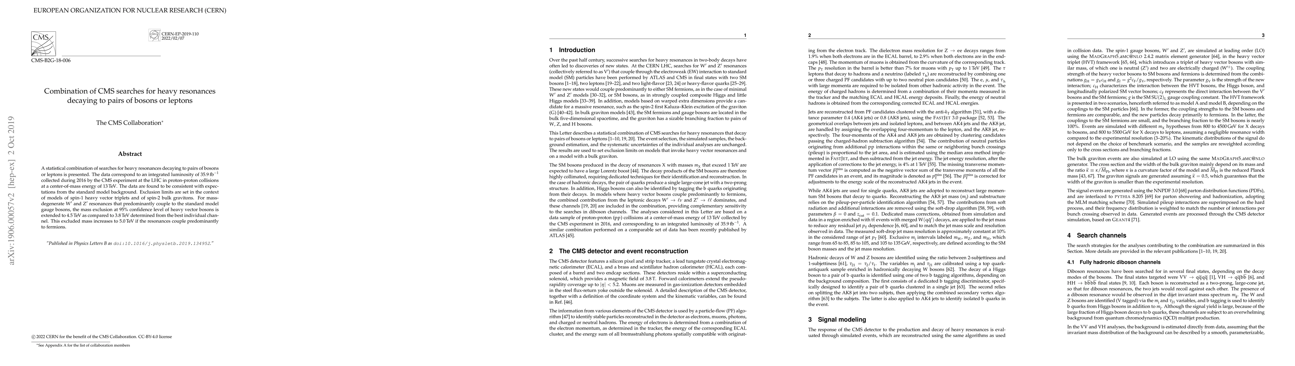 This paper combines CMS searches for heavy resonances decaying into boson or lepton pairs, analyzing 35.9 fb$^{-1}$ of LHC data at 13 TeV. The results are consistent with standard model predictions, extending exclusion limits to 4.5 TeV for vector bosons and 5.0 TeV for those coupling to fermions.