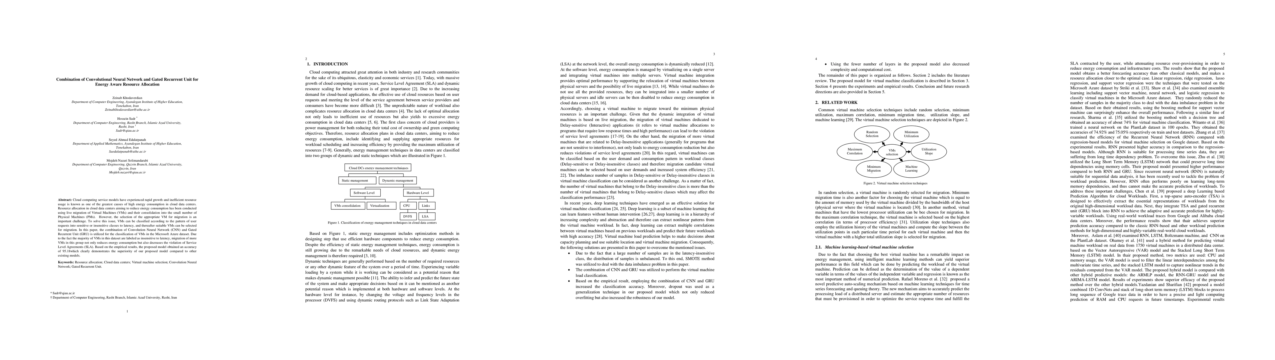 This paper proposes a combination of Convolutional Neural Network (CNN) and Gated Recurrent Unit (GRU) to classify Virtual Machines (VMs) for energy-efficient resource allocation in cloud data centers, achieving 95.18% accuracy. The model prioritizes migrating VMs insensitive to latency, thereby reducing energy consumption and SLA violations.