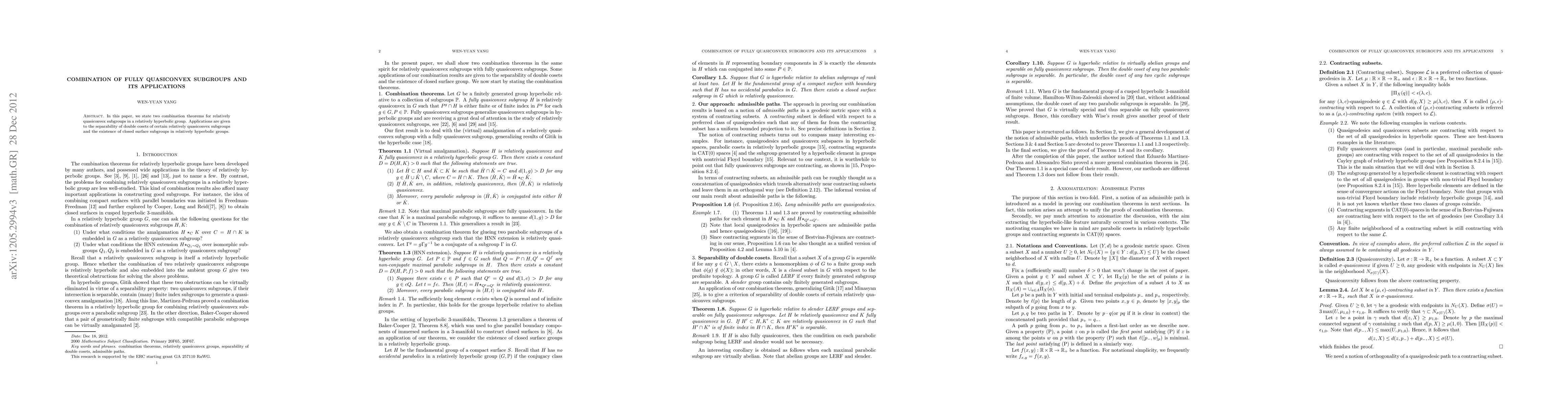 In this paper, we state two combination theorems for relatively quasiconvex subgroups in a relatively hyperbolic group. Applications are given to the separability of double cosets of certain relatively quasiconvex subgroups and the existence of closed surface subgroups in relatively hyperbolic groups.