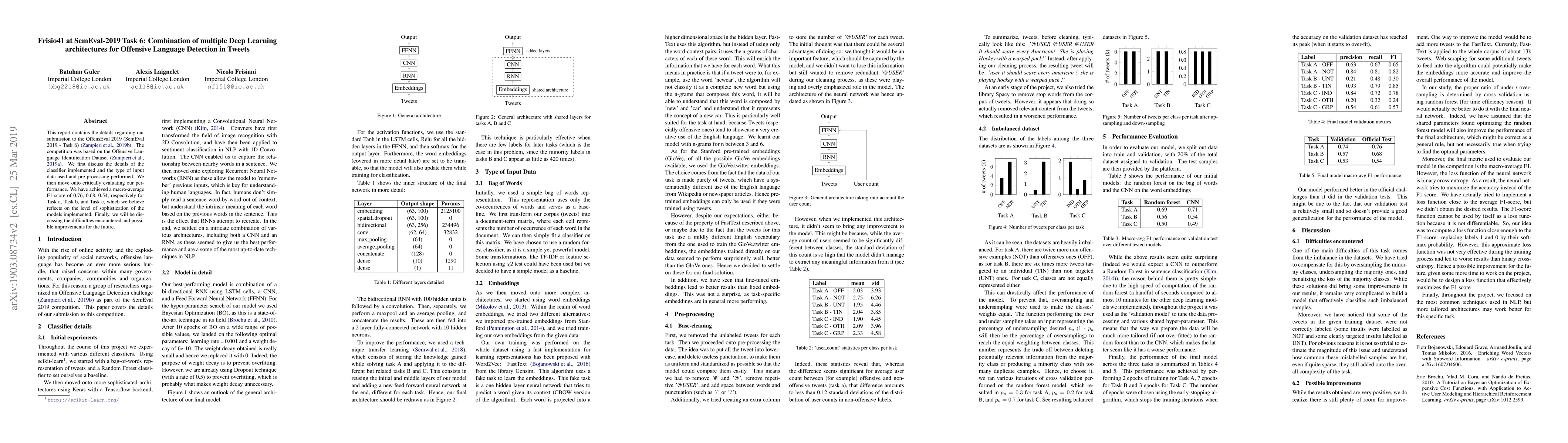 This report contains the details regarding our submission to the OffensEval 2019 (SemEval 2019 - Task 6). The competition was based on the Offensive Language Identification Dataset. We first discuss the details of the classifier implemented and the type of input data used and pre-processing performed. We then move onto critically evaluating our performance. We have achieved a macro-average F1-score of 0.76, 0.68, 0.54, respectively for Task a, Task b, and Task c, which we believe reflects on the level of sophistication of the models implemented. Finally, we will be discussing the difficulties encountered and possible improvements for the future.