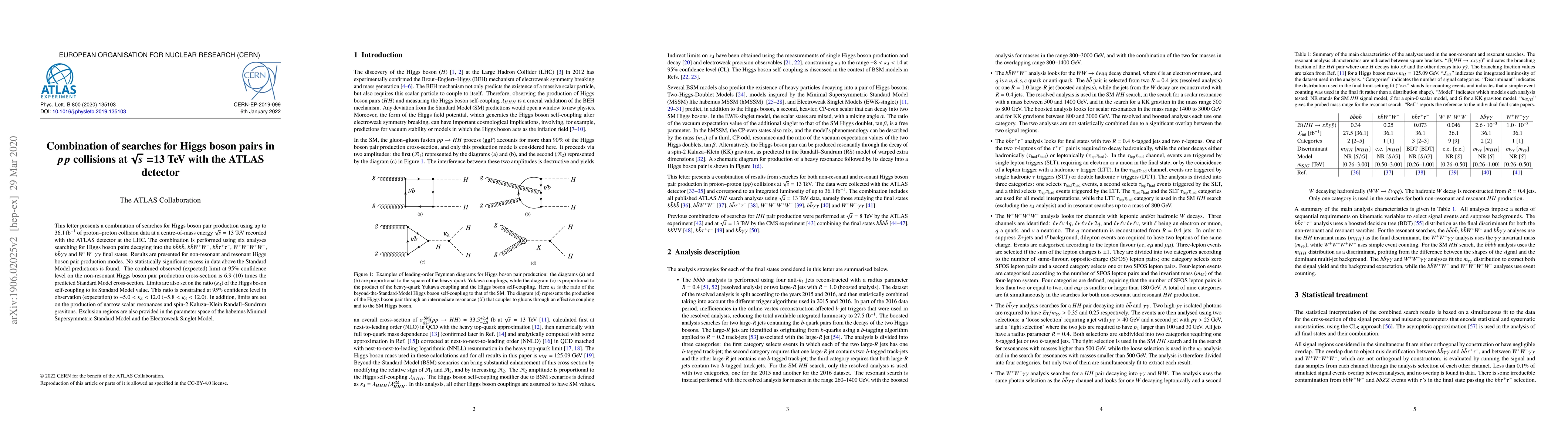 This paper combines multiple searches for Higgs boson pairs using 36.1 fb$^{-1}$ of LHC data at 13 TeV with the ATLAS detector, finding no significant excess over Standard Model predictions. The study sets limits on non-resonant Higgs pair production and constrains the ratio of Higgs self-coupling to its Standard Model value.