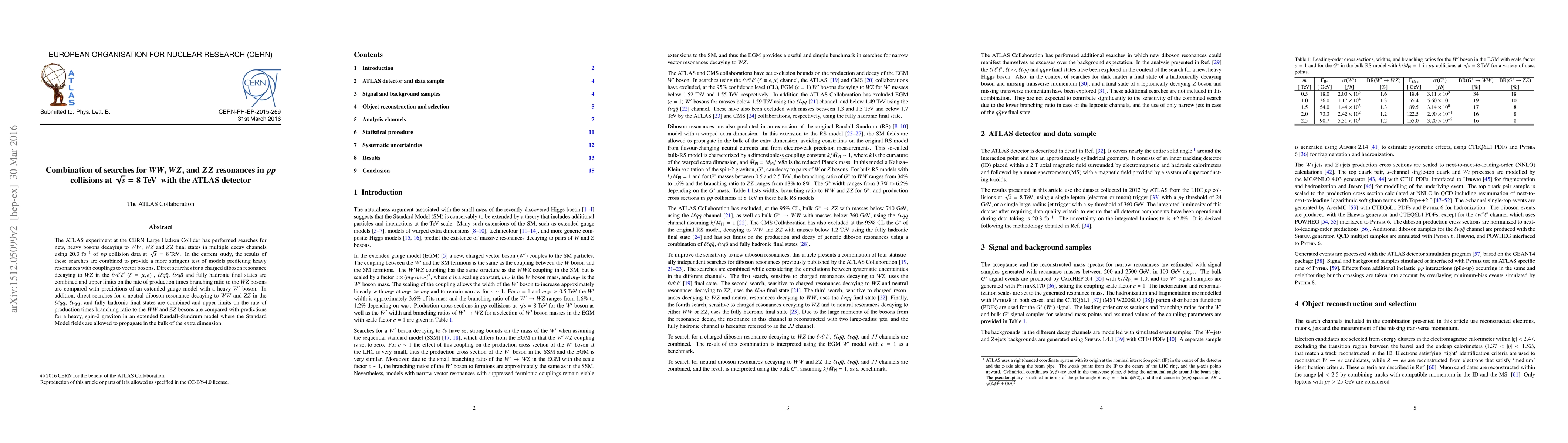 The ATLAS experiment combines searches for heavy bosons decaying into $WW$, $WZ$, and $ZZ$ final states in $pp$ collisions at $\sqrt{s} = 8$ TeV, using 20.3 fb$^{-1}$ of data, to test extended gauge models and Randall-Sundrum models predicting new resonances. Upper limits on production rates are compared with theoretical predictions for heavy $W'$ and spin-2 gravitons.