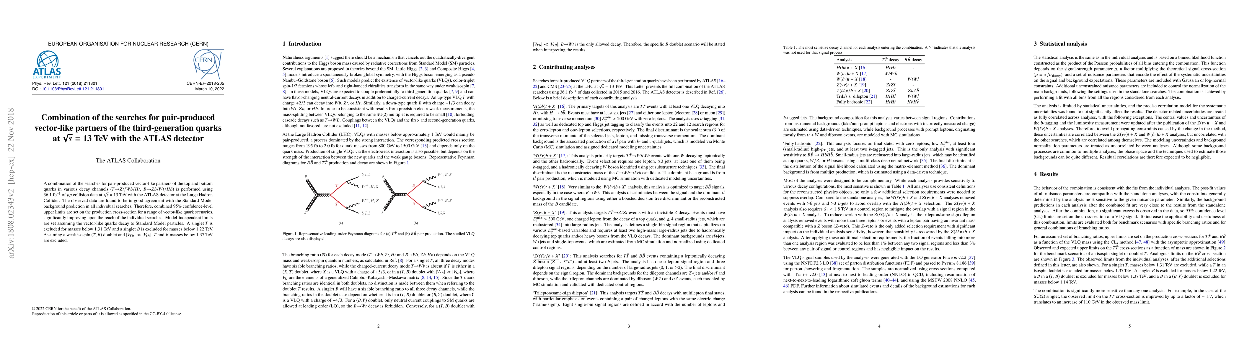 This paper combines various searches for pair-produced vector-like partners of third-generation quarks using 36.1 fb$^{-1}$ of data at 13 TeV with the ATLAS detector. No evidence of these particles was found, leading to improved 95% confidence-level upper limits on their production cross-sections, excluding singlet $T$ below 1.31 TeV and singlet $B$ below 1.22 TeV.