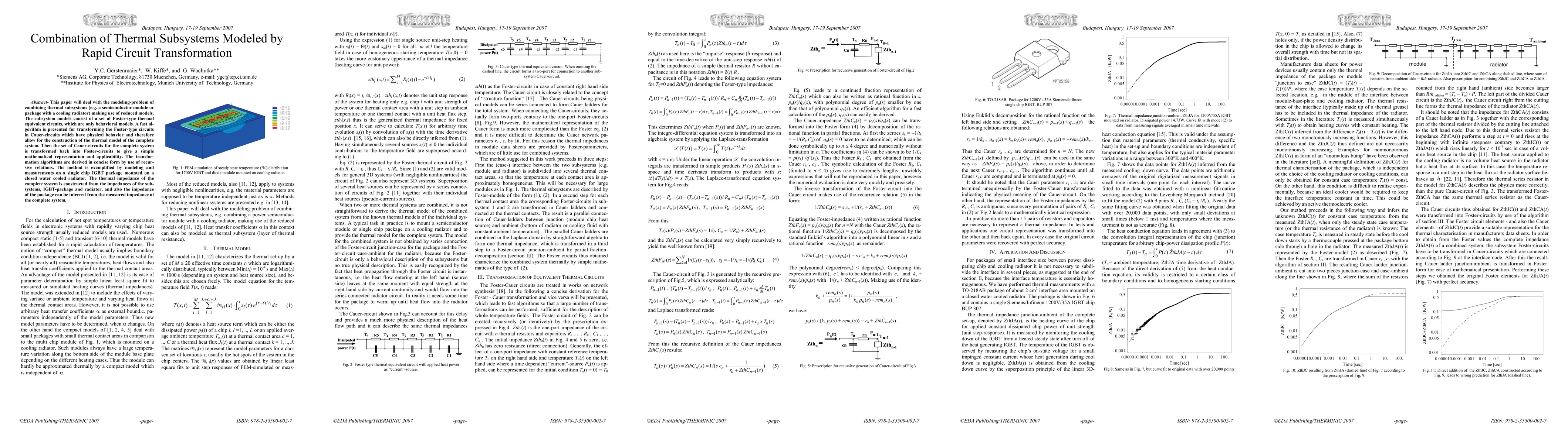 This paper will deal with the modeling-problem of combining thermal subsystems (e.g. a semiconductor module or package with a cooling radiator) making use of reduced models. The subsystem models consist of a set of Foster-type thermal equivalent circuits, which are only behavioral models. A fast al-gorithm is presented for transforming the Foster-type circuits in Cauer-circuits which have physical behavior and therefore allow for the construction of the thermal model of the complete system. Then the set of Cauer-circuits for the complete system is transformed back into Foster-circuits to give a simple mathematical representation and applicability. The transfor-mation algorithms are derived in concise form by use of recur-sive relations. The method is exemplified by modeling and measurements on a single chip IGBT package mounted on a closed water cooled radiator. The thermal impedance of the complete system is constructed from the impedances of the sub-systems, IGBT-package and radiator, and also the impedance of the package can be inferred from the measured impedance of the complete system.