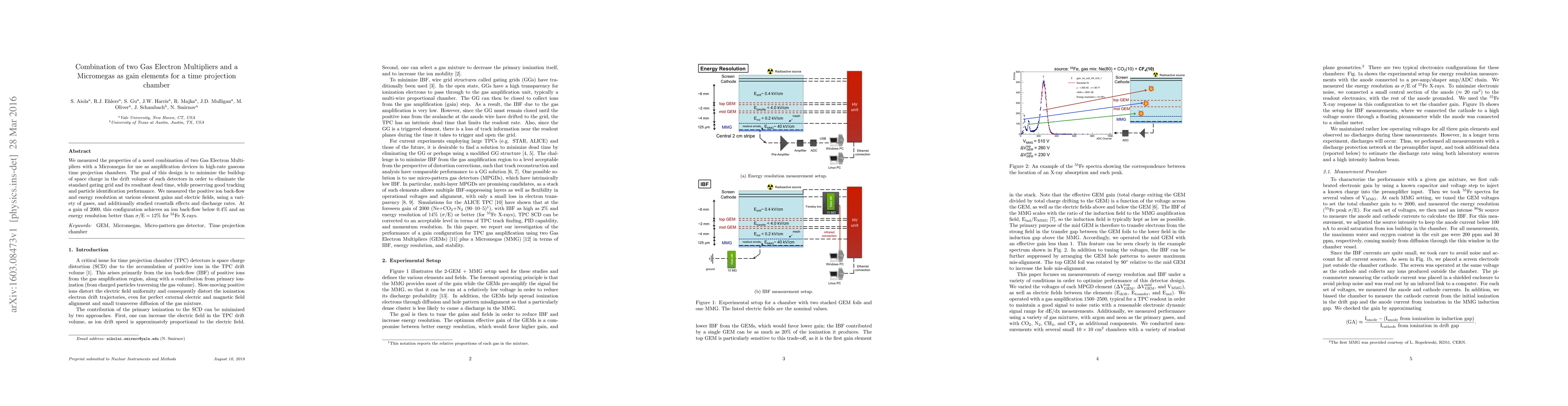 We measured the properties of a novel combination of two Gas Electron Multipliers with a Micromegas for use as amplification devices in high-rate gaseous time projection chambers. The goal of this design is to minimize the buildup of space charge in the drift volume of such detectors in order to eliminate the standard gating grid and its resultant dead time, while preserving good tracking and particle identification performance. We measured the positive ion back-flow and energy resolution at various element gains and electric fields, using a variety of gases, and additionally studied crosstalk effects and discharge rates. At a gain of 2000, this configuration achieves an ion back-flow below 0.4% and an energy resolution better than $\sigma/\text{E}=12\%$ for $^{55}$Fe X-rays.
