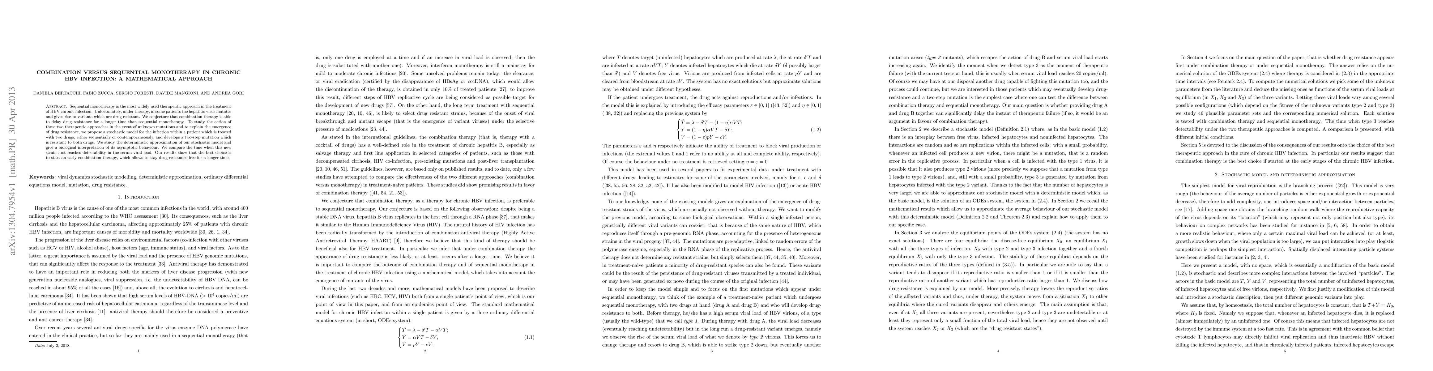 This paper proposes a mathematical model to compare sequential and combination therapies for chronic HBV infection, finding that combination therapy delays the emergence of drug-resistant mutations more effectively than sequential monotherapy. The study concludes that early combination therapy is the optimal strategy to prolong drug-resistance free periods.