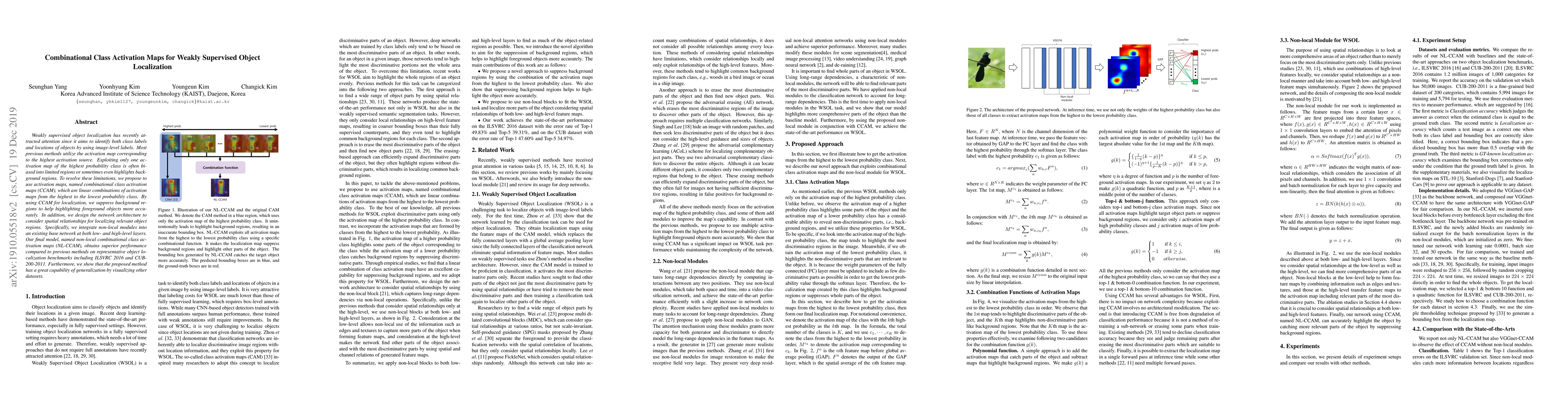 This paper proposes a method called non-local combinational class activation maps (NL-CCAM) for weakly supervised object localization, using linear combinations of activation maps from highest to lowest probability classes to better highlight objects. The method integrates non-local modules to consider spatial relationships and outperforms previous methods on benchmarks like ILSVRC 2016 and CUB-200-2011.