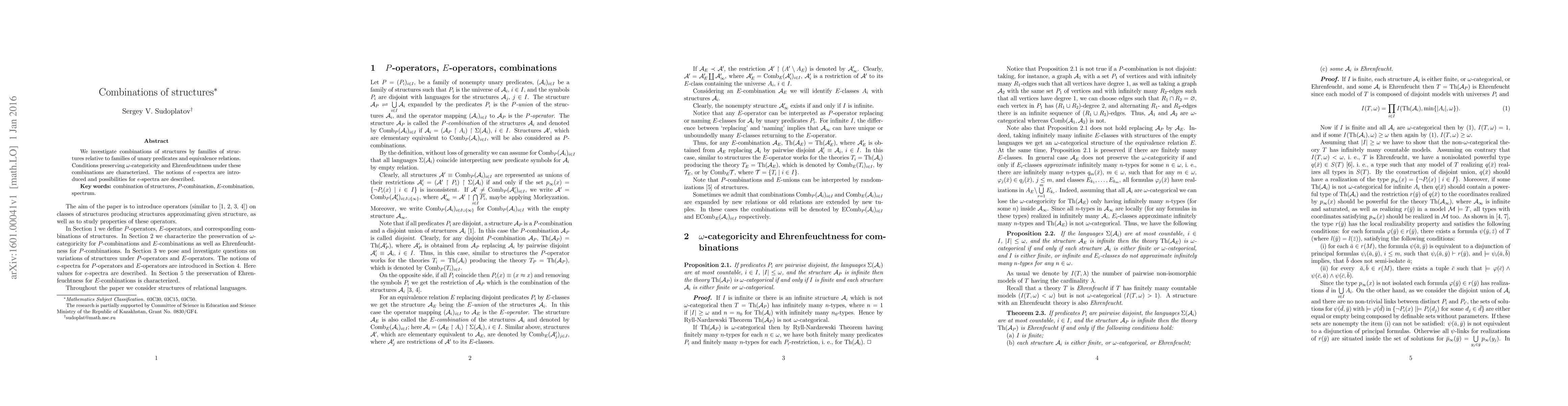 We investigate combinations of structures by families of structures relative to families of unary predicates and equivalence relations. Conditions preserving $\omega$-categoricity and Ehrenfeuchtness under these combinations are characterized. The notions of $e$-spectra are introduced and possibilities for $e$-spectra are described.