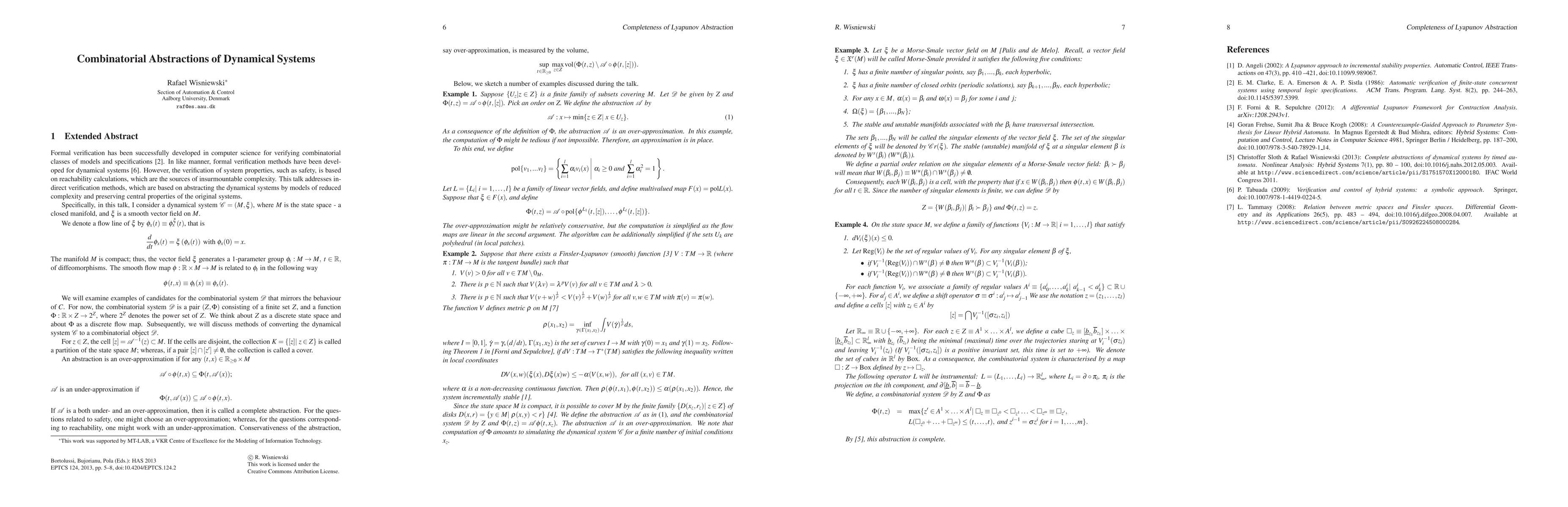Formal verification has been successfully developed in computer science for verifying combinatorial classes of models and specifications. In like manner, formal verification methods have been developed for dynamical systems. However, the verification of system properties, such as safety, is based on reachability calculations, which are the sources of insurmountable complexity. This talk addresses indirect verification methods, which are based on abstracting the dynamical systems by models of reduced complexity and preserving central properties of the original systems.