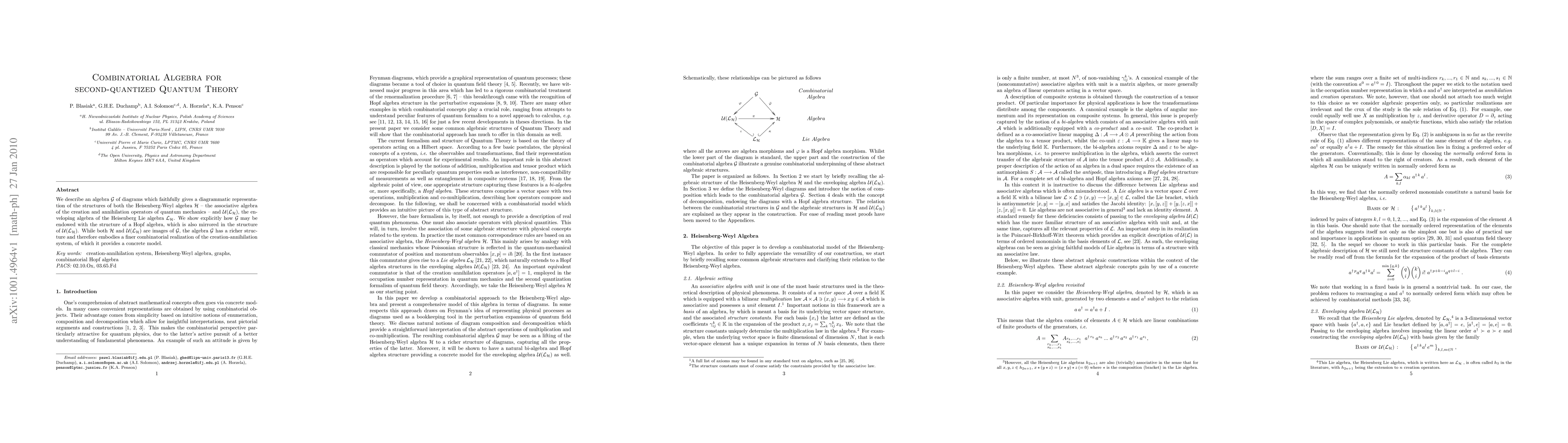 We describe an algebra G of diagrams which faithfully gives a diagrammatic representation of the structures of both the Heisenberg-Weyl algebra H - the associative algebra of the creation and annihilation operators of quantum mechanics - and U(L_H), the enveloping algebra of the Heisenberg Lie algebra L_H. We show explicitly how G may be endowed with the structure of a Hopf algebra, which is also mirrored in the structure of U(L_H). While both H and U(L_H) are images of G, the algebra G has a richer structure and therefore embodies a finer combinatorial realization of the creation-annihilation system, of which it provides a concrete model.