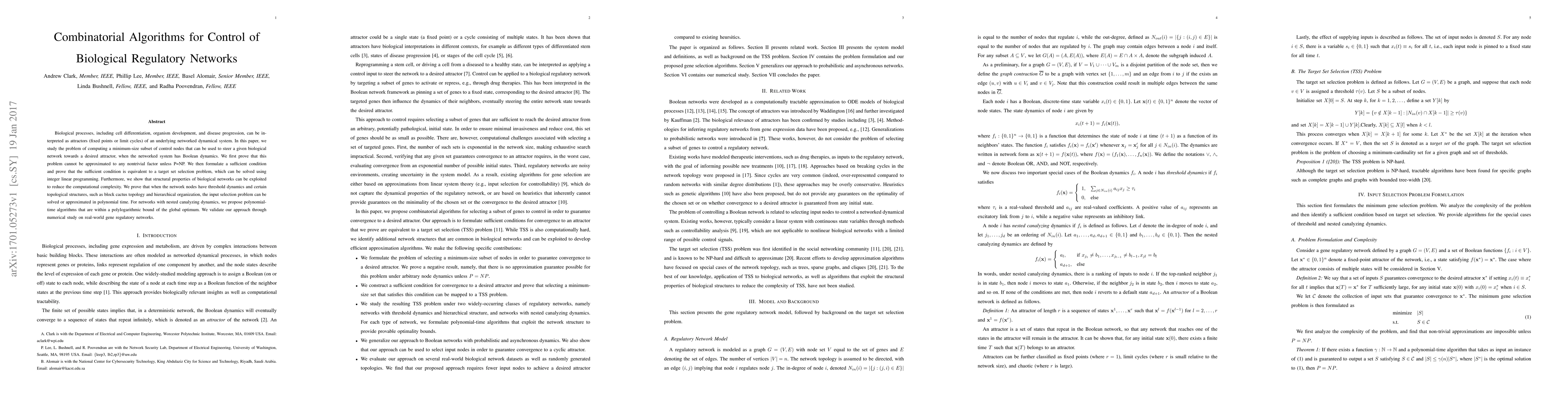 This paper explores combinatorial algorithms for controlling biological regulatory networks by identifying minimum control nodes to steer the system towards desired attractors. It proves the problem's inapproximability unless P=NP and proposes integer linear programming for solving a related target set selection problem, leveraging structural properties for polynomial-time solutions.