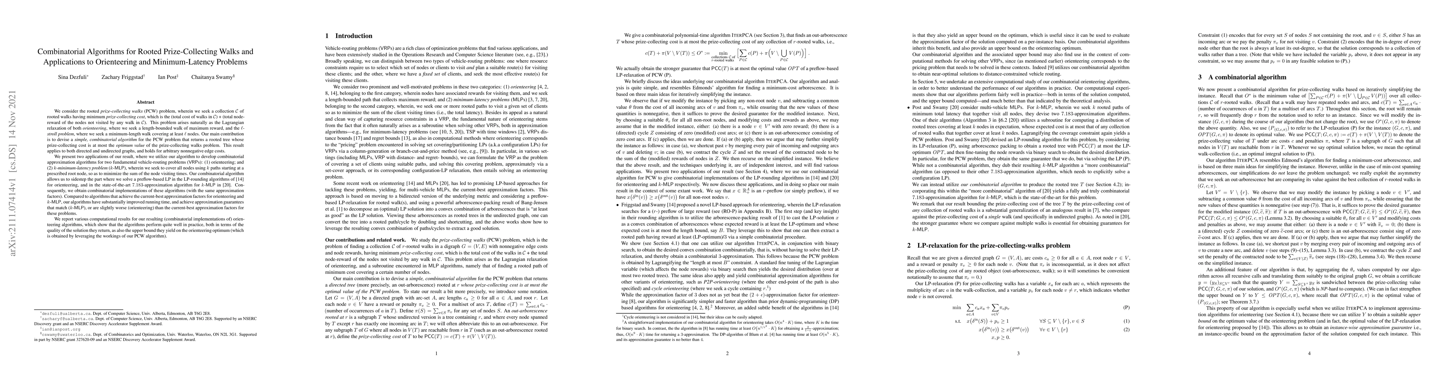 We consider the rooted prize-collecting walks (PCW) problem, wherein we seek a collection $C$ of rooted walks having minimum prize-collecting cost, which is the (total cost of walks in $C$) + (total node-reward of nodes not visited by any walk in $C$). This problem arises naturally as the Lagrangian relaxation of both orienteering, where we seek a length-bounded walk of maximum reward, and the $\ell$-stroll problem, where we seek a minimum-length walk covering at least $\ell$ nodes. Our main contribution is to devise a simple, combinatorial algorithm for the PCW problem in directed graphs that returns a rooted tree whose prize-collecting cost is at most the optimum value of the prize-collecting walks problem. We utilize our algorithm to develop combinatorial approximation algorithms for two fundamental vehicle-routing problems (VRPs): (1) orienteering; and (2) $k$-minimum-latency problem ($k$-MLP), wherein we seek to cover all nodes using $k$ paths starting at a prescribed root node, so as to minimize the sum of the node visiting times. Our combinatorial algorithm allows us to sidestep the part where we solve a preflow-based LP in the LP-rounding algorithms of Friggstand and Swamy (2017) for orienteering, and in the state-of-the-art $7.183$-approximation algorithm for $k$-MP in Post and Swamy (2015). Consequently, we obtain combinatorial implementations of these algorithms with substantially improved running times compared with the current-best approximation factors. We report computational results for our resulting (combinatorial implementations of) orienteering algorithms, which show that the algorithms perform quite well in practice, both in terms of the quality of the solution they return, as also the upper bound they yield on the orienteering optimum (which is obtained by leveraging the workings of our PCW algorithm).