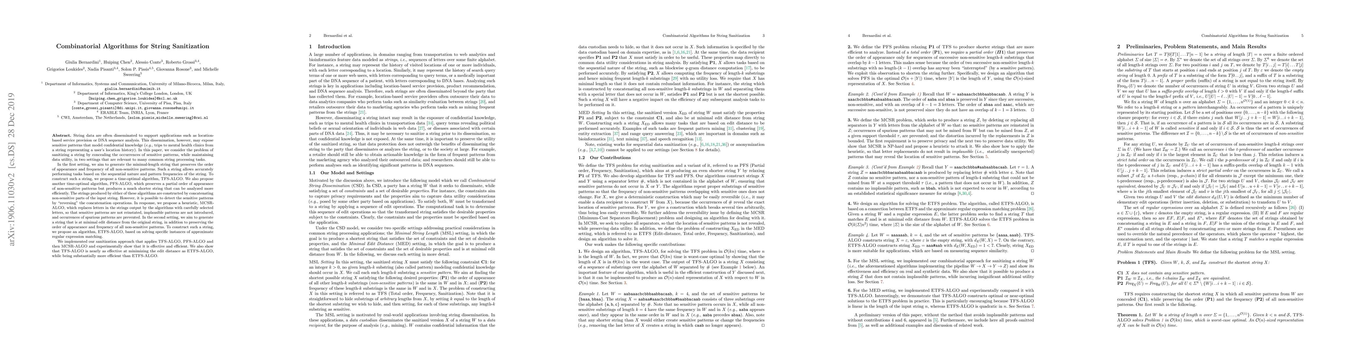 This paper presents combinatorial algorithms for sanitizing strings to conceal sensitive patterns while maintaining data utility. It proposes TFS-ALGO and PFS-ALGO for generating minimal-length strings preserving pattern order and frequency, and introduces MCSR-ALGO to prevent sensitive pattern detection. Additionally, ETFS-ALGO is developed for strings with minimal edit distance from the original while preserving non-sensitive patterns.