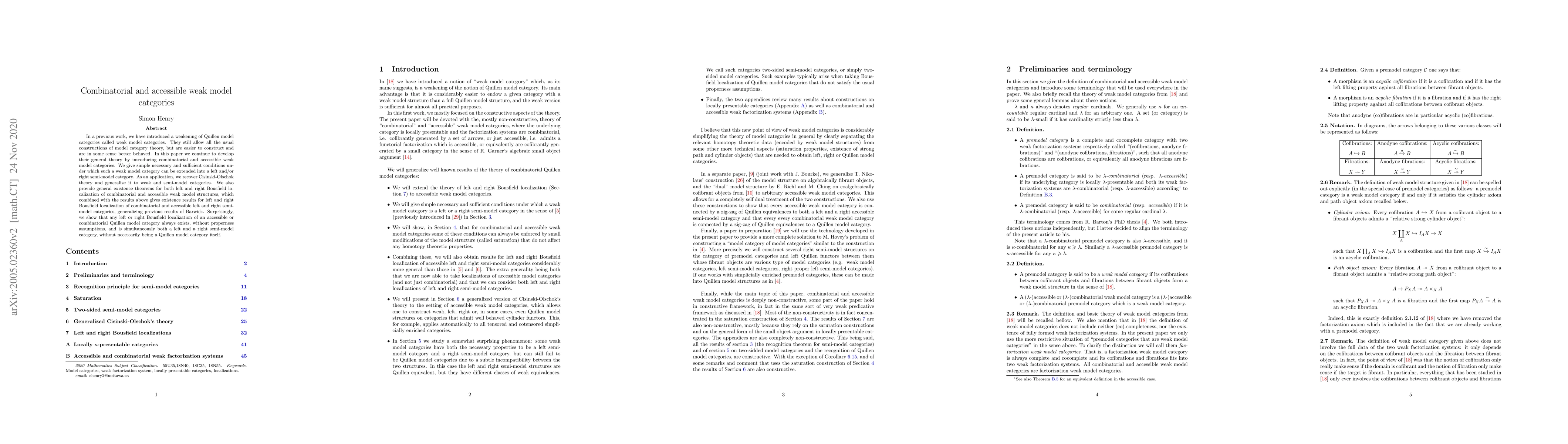 This paper develops the theory of weak model categories by introducing combinatorial and accessible versions, providing conditions for their extension into semi-model categories, and proving existence theorems for Bousfield localizations. It generalizes Cisinski-Olschok theory and demonstrates that Bousfield localizations of accessible or combinatorial Quillen model categories exist without properness assumptions, yielding left and right semi-model categories.
