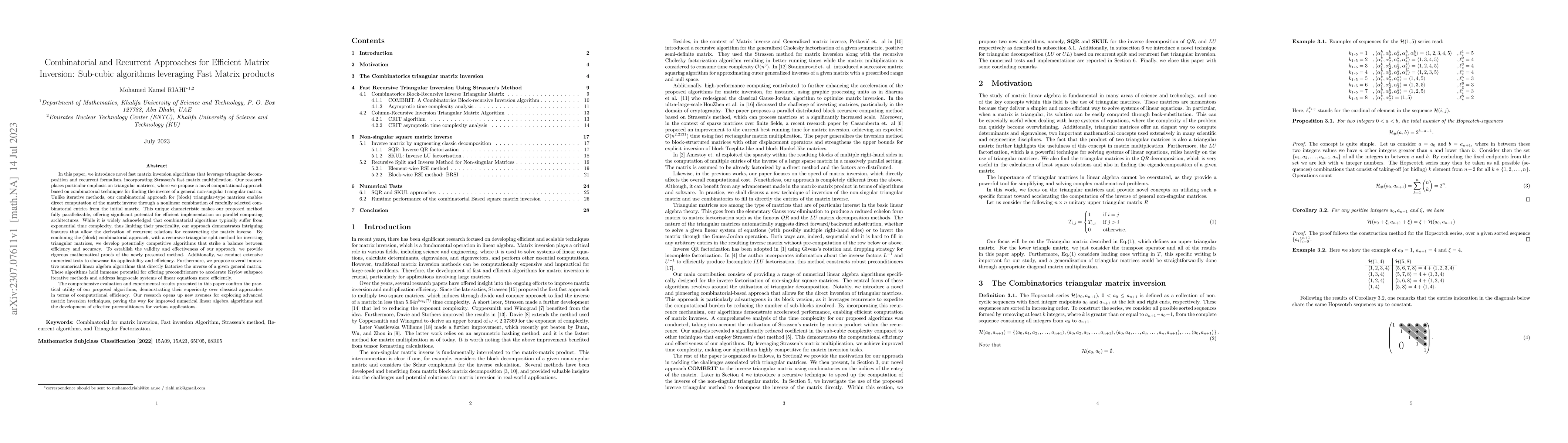 This paper proposes novel fast matrix inversion algorithms using combinatorial and recurrent techniques, specifically for triangular matrices. The method combines Strassen's fast matrix multiplication with a direct, parallelizable combinatorial approach, demonstrating superior computational efficiency over traditional methods.