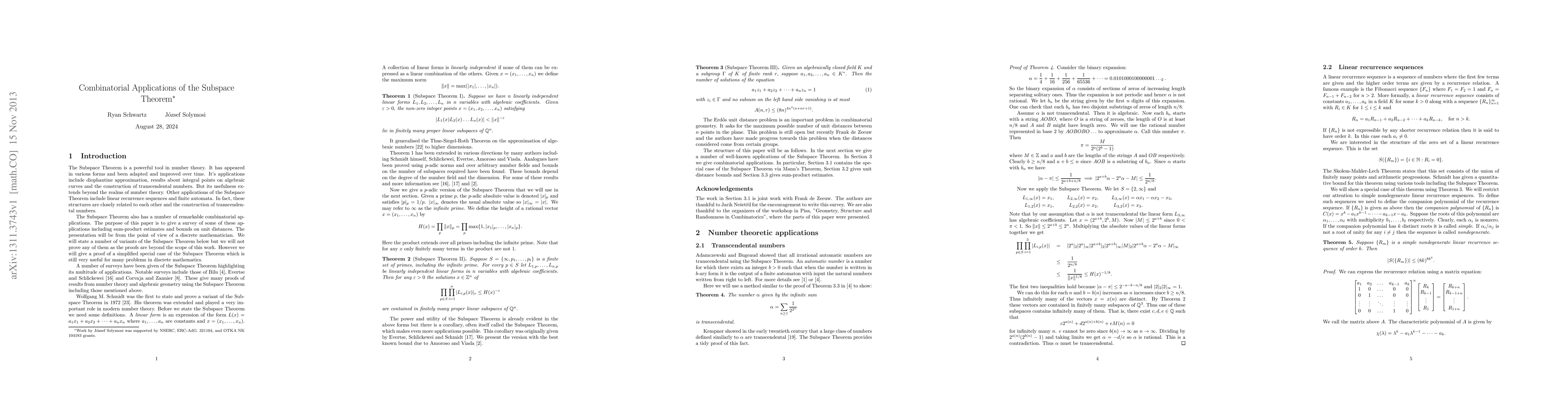 The Subspace Theorem is a powerful tool in number theory. It has appeared in various forms and been adapted and improved over time. It's applications include diophantine approximation, results about integral points on algebraic curves and the construction of transcendental numbers. But its usefulness extends beyond the realms of number theory. Other applications of the Subspace Theorem include linear recurrence sequences and finite automata. In fact, these structures are closely related to each other and the construction of transcendental numbers. The Subspace Theorem also has a number of remarkable combinatorial applications. The purpose of this paper is to give a survey of some of these applications including sum-product estimates and bounds on unit distances. The presentation will be from the point of view of a discrete mathematician. We will state a number of variants of the Subspace Theorem below but we will not prove any of them as the proofs are beyond the scope of this work. However we will give a proof of a simplified special case of the Subspace Theorem which is still very useful for many problems in discrete mathematics.