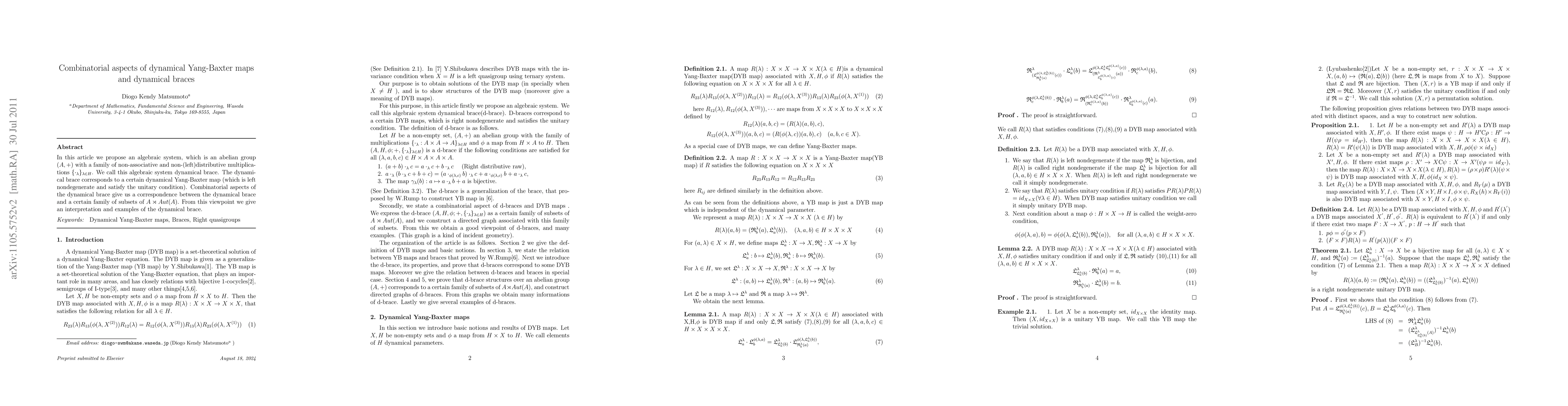 In this article we propose an algebraic system, which is an abelian group $(A,+)$ with a family of non-associative and non-(left)distributive multiplications $\{\cdot_{\lambda}\}_{\lambda\in H}$. We call this algebraic system dynamical brace. The dynamical brace corresponds to a certain dynamical Yang-Baxter map (which is left nondegenerate and satisfy the unitary condition). Combinatorial aspects of the dynamical brace give us a correspondence between the dynamical brace and a certain family of subsets of $A\rtimes Aut(A)$. From this viewpoint we give an interpretation and examples of the dynamical brace.