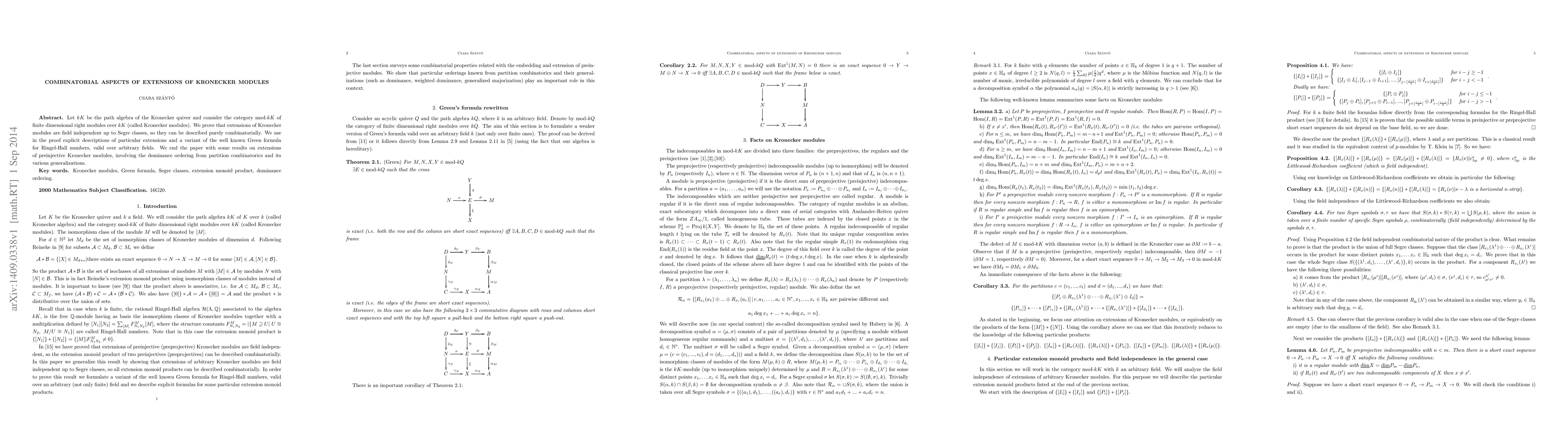 This paper proves that extensions of Kronecker modules are field independent and thus combinatorially described, using explicit extensions and a variant of the Green formula. It concludes with results on preinjective Kronecker modules involving dominance ordering from partition combinatorics.