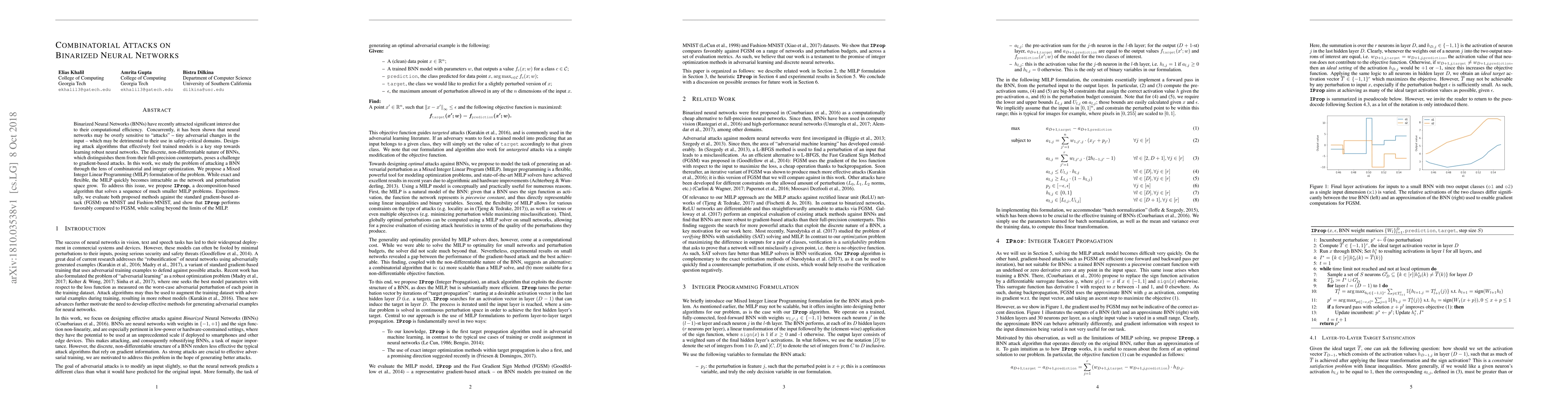 This paper investigates combinatorial attacks on Binarized Neural Networks (BNNs), proposing a Mixed Integer Linear Programming (MILP) formulation to tackle their discrete nature. It introduces IProp, a decomposition-based algorithm that solves smaller MILP problems, demonstrating superior performance over standard gradient-based attacks (FGSM) on MNIST and Fashion-MNIST datasets.